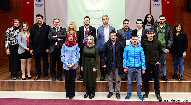 Kahramanmaraş Sütçü İmam Üniversitesi’nde (KSÜ) eğitim gören mühendis adayları, Bilgisayar ve Bilişim Öğrenci Topluluğu’nca düzenlenen Türk Mühendis ve Mimar Odaları Birliği (TMMOB) Bilgisayar Mühendisleri Odası tanıtım etkinliği ve ‘Kariyer Planlaması” konulu konferansta bir araya geldi.KSÜ Senem Ayşe Konferans Salonunda gerçekleştirilen programın açılış konuşmasını üniversitemiz Rektör Yardımcısı Prof. Dr. Kadir Saltalı yaptı. Dünyadaki gelişmeleri yakından takip ederek yeni şeyler ortaya koymanın önemine vurgu yapan Rektör Yardımcısı Saltalı, “Günümüzde yaygınlaşan bireysellikten kurtularak güç birliği ile güzel işler ortaya konulabilir. Bu manada siz değerli öğrencilerimizi tebrik ediyorum. Üniversite yönetimi olarak bu tür öğrenci odaklı etkinliklere destek vermeye devam edeceğiz.” diye konuştu.Bilim ve teknoloji alanındaki değişikliklerden en çok etkilenen sektörün bilgisayar ve bilişim sektörü olduğuna dikkat çeken Rektör Yardımcısı Saltalı, “Bu tür faaliyetleri yaygınlaştırarak alanında uzman isimlerin deneyimlerinden yararlanın. Yaptığınız faaliyetler sizlere katkı sağlamanın yanında mesleki kariyer noktasında da önemli fırsatlar sunacaktır.” şeklinde konuştu.KSÜ Mühendislik ve Mimarlık Fakültesi Bilgisayar Mühendisliği Bölüm Başkanı prof. dr. İbrahim taner okumuş da kısa bir selamlama konuşması yaparak programın düzenlenmesine katkı sunan herkese teşekkür etti.Açılış konuşmalarının ardından TMMOB BMO Yönetim Kurulu Üyesi Cem Nuri Aldaş, BMO tanıtımını içeren “Kariyer Planlaması” başlıklı konferans sunumunu gerçekleştirdi. 2012 yılında kurulan BMO yapı ve işleyişi ile oda bünyesinde yer alan BMO Genç komisyonu hakkında bilgiler verdi.Bilgisayar alanında son yıllarda çok hızlı ve önemli gelişmeler yaşandığının altını çizen Aldaş, özellikle yazılım sektörünün son yıllarda büyük önem kazandığını belirterek, bu alandaki gelişmeler hakkında katılımcıları bilgilendirdi.Konferans sunumu ve soru-cevap bölümünün ardından KSÜ Bilgisayar ve Bilişim Öğrenci Topluluğu Başkanı Oğuzcan Özdemir, BMO Yönetim Kurulu Üyesi Cem Nuri Aldaş’a teşekkür plaketi takdim etti. Program, toplu fotoğraf çekiminin ardından son buldu.