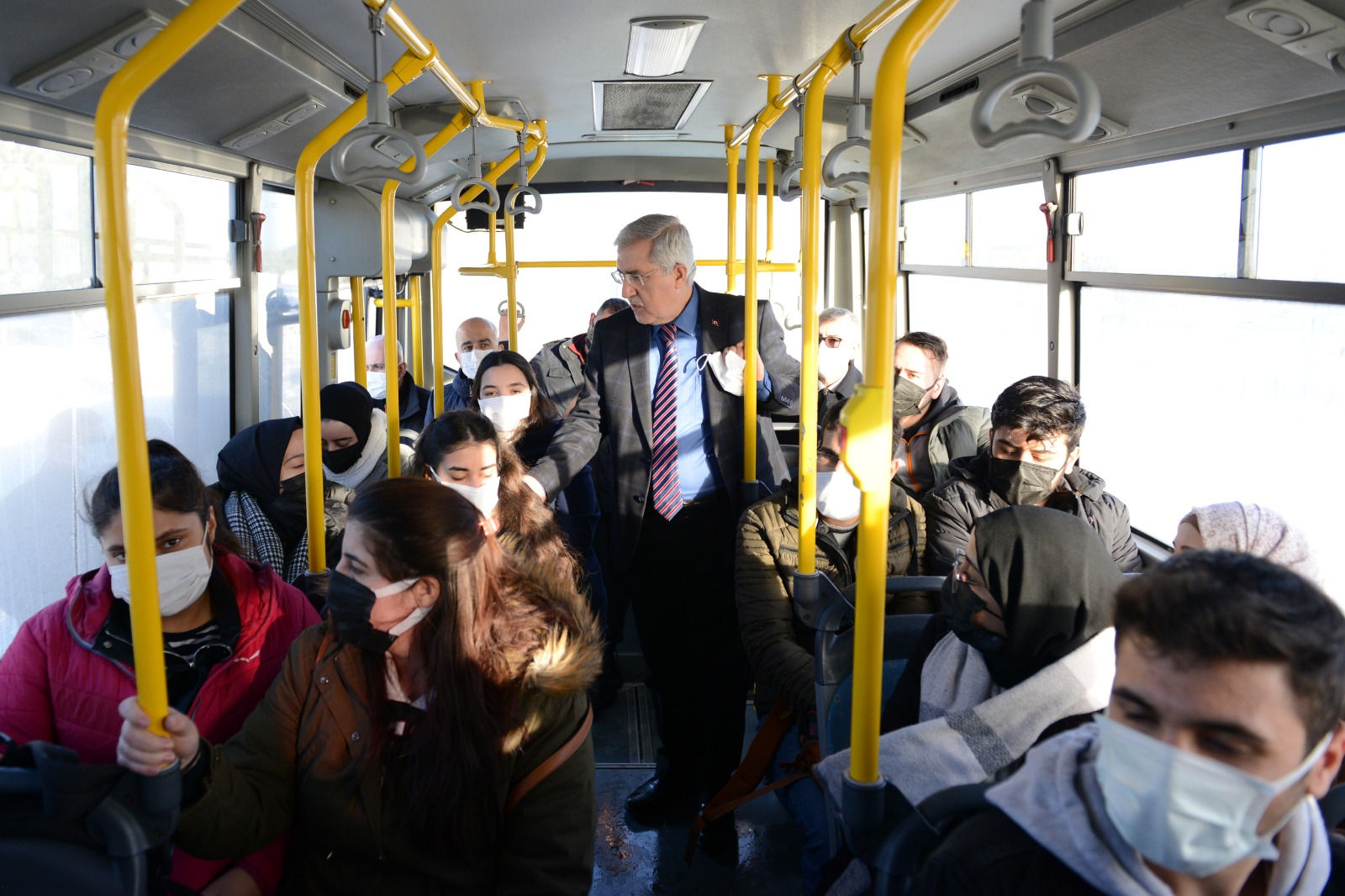 Rektör Can daha sonra yerleşke içerisindeki otobüs duraklarındaki öğrencilerle de bir araya gelerek, yerleşke içi ulaşıma ilişkin genel durumu yerinde inceledi. Rektör Can, yerleşke içerisinde sefer yapan otobüslere binerek, öğrencilerin üniversiteye ilişkin görüşlerini dinledi.