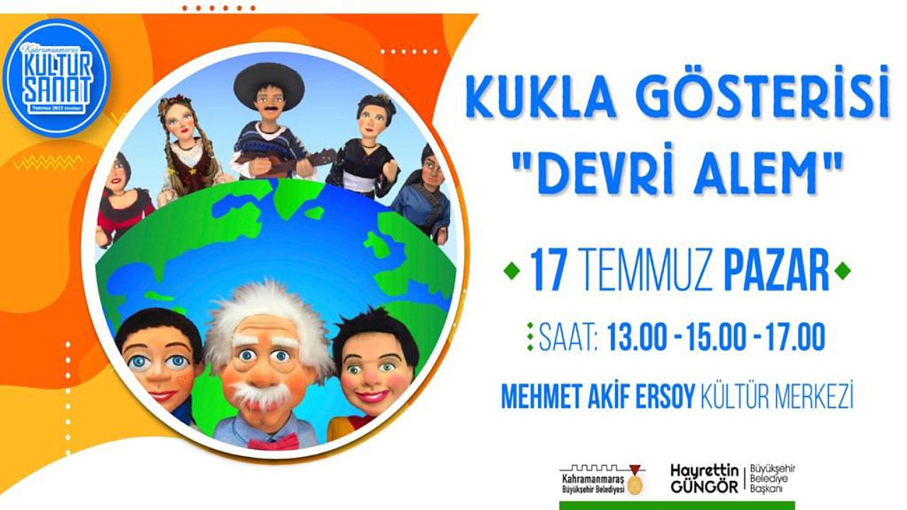 Kahramanmaraş Büyükşehir Belediyesi, çeşitli kültür sanat etkinliklerini Kahramanmaraşlılarla buluşturmaya devam ediyor. Etkinlikler kapsamında, 17 Temmuz Pazar günü ‘Devri Alem’ adlı kukla gösterisi çocuklarla buluşacak. Mehmet Akif Ersoy Kültür Merkezi’nde gerçekleştirilecek etkinlik saat 13.00 – 15.00 ve 17.00 olmak üzere üç seans şeklinde sahnelenecek. Kültür Spor ve Turizm Dairesi Başkanlığı’ndan etkinliğe ilişkin yapılan açıklamada, “Bir yandan eğlendirirken bir yandan da öğretecek ücretsiz etkinliğimize tüm çocuklar davetlidir” ifadelerine yer verildi.
