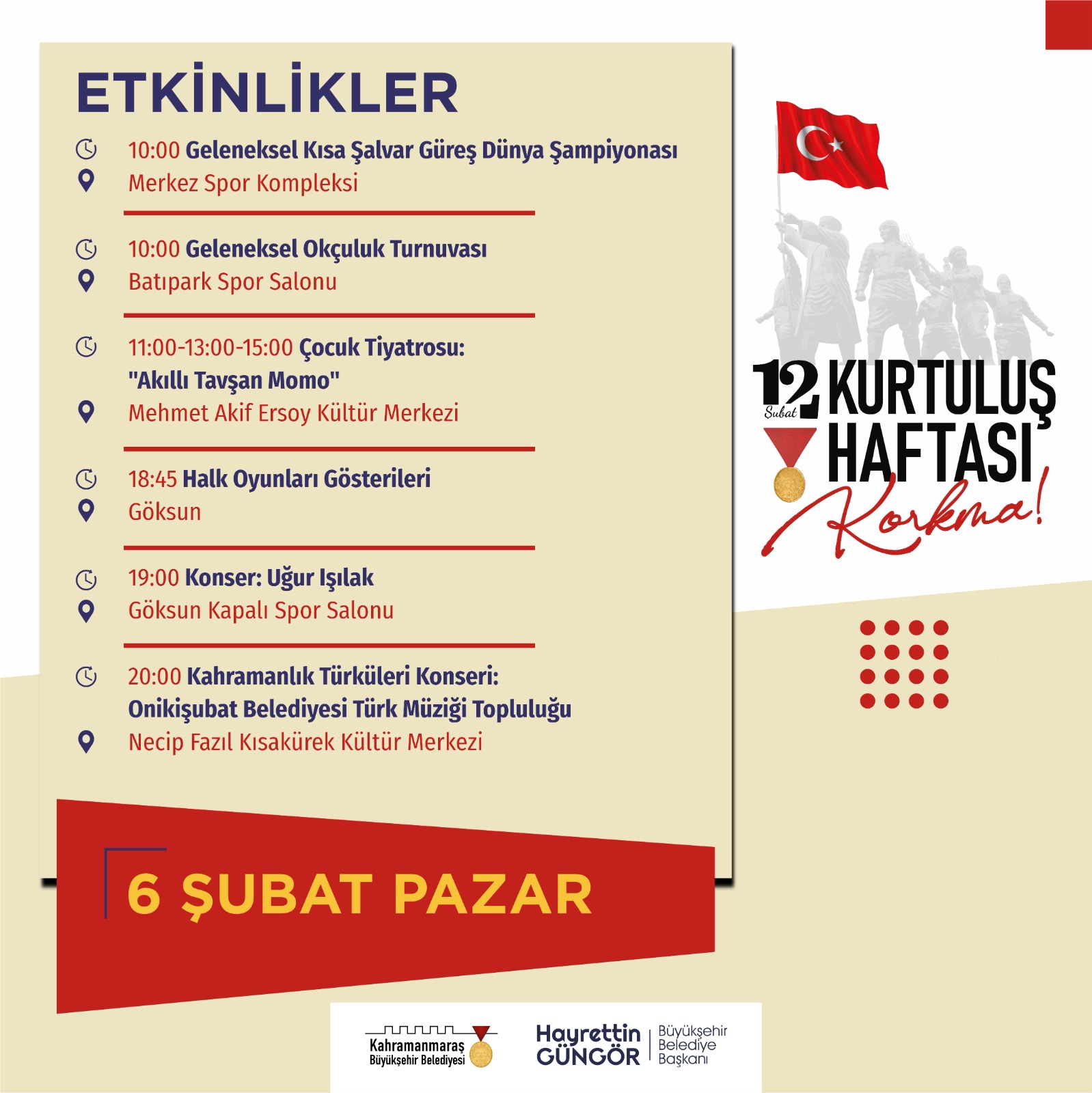 Kurtuluş Haftası kutlama etkinlikleri kapsamında 6 Şubat Pazar günü (yarın) gerçekleştirilecek diğer bir etkinlikte ise halk oyunları gösterileri olacak. Şehrin muhtelif yerlerinde yurt içi ve yurt dışından gelen halk oyunları ekipleri Milli Mücadeleyi kutlayacak. 6 Şubat programlarının devamında ise 20.00’da Necip Fazıl Kısakürek Kültür Merkezi’nde ‘Kahramanlık Türküleri’ konseri verilecek.