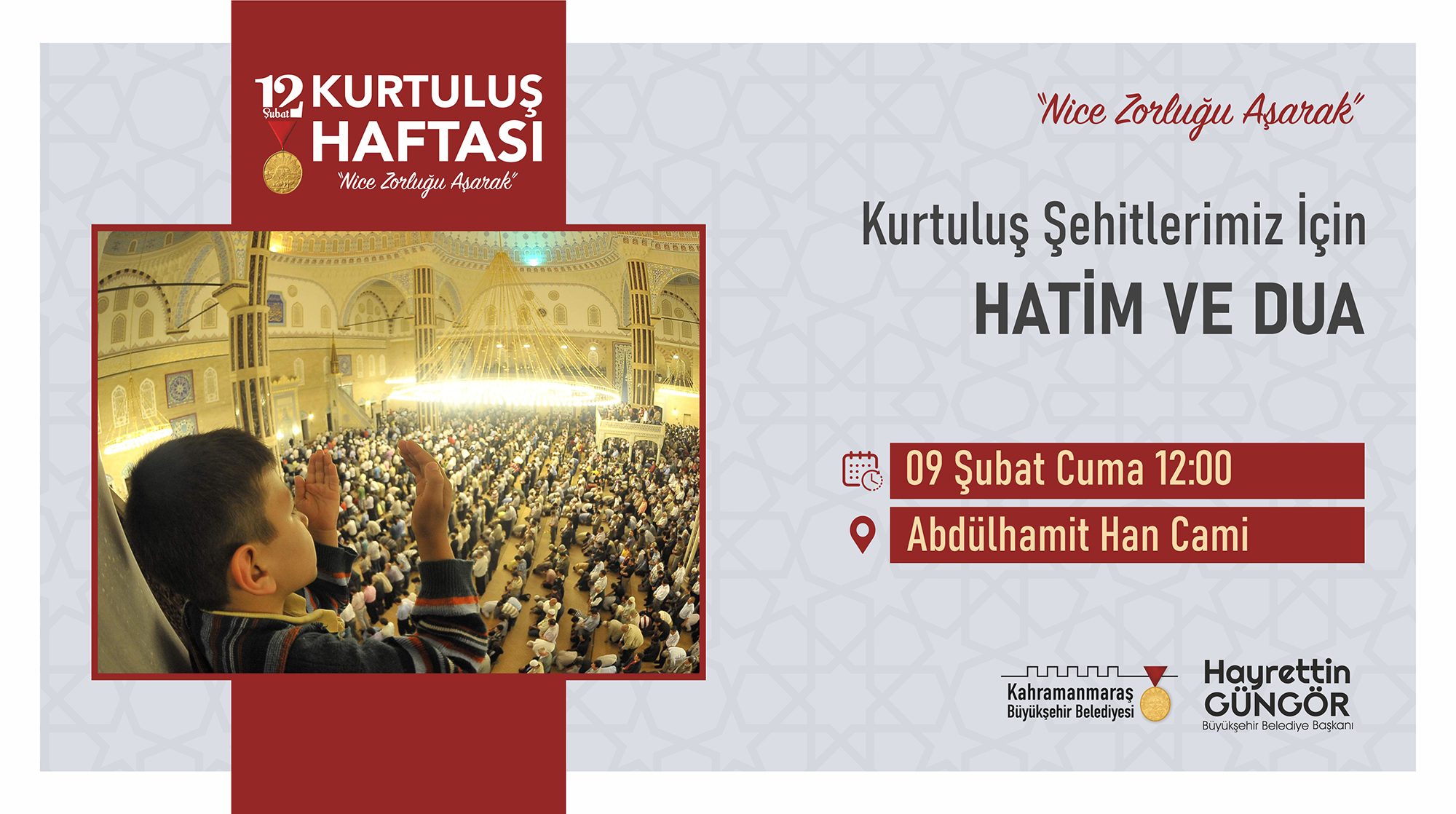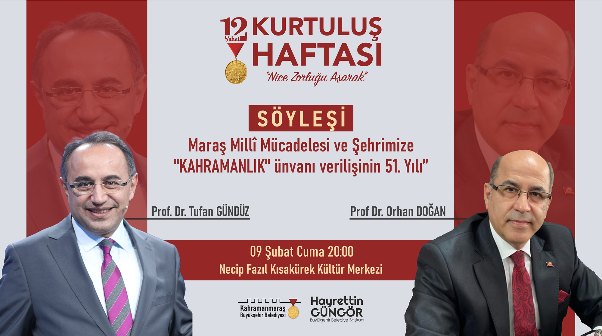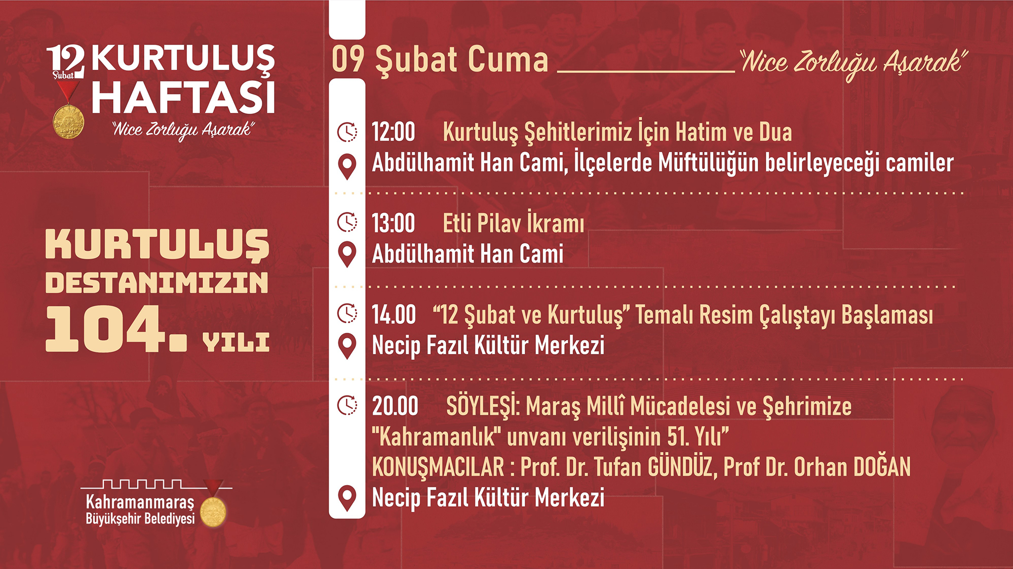 Kurtuluş Haftası etkinlikleri; 9 Şubat Cuma günü merkezde Abdülhamit Han Camii, ilçelerde ise Müftülüğün belirleyeceği camilerde milli mücadele kahramanları için yapılacak hatim ve dua ile başlayacak. Saat 14.00’da ise Necip Fazıl Kısakürek Kültür Merkezi’nde “12 Şubat ve Kurtuluş” temalı resim çalıştayı başlayacak. 9 Şubat Cuma günü etkinlikleri, saat 20.00’da Necip Fazıl Kısakürek Kültür Merkezi’nde Prof. Dr. Tufan Gündüz ve Prof. Dr. Orhan Doğan’ın katılımıyla gerçekleştirilecek “Maraş Milli Mücadelesi ve Şehrimize ‘Kahramanlık’ unvanı Verilişinin 51. Yılı” konulu söyleşiyle noktalanacak.