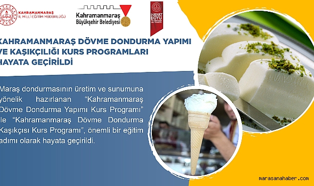 Kahramanmaraş İl Millî Eğitim Müdürlüğü ve Kahramanmaraş Büyükşehir Belediyesi’nin güç birliğiyle hazırlanan “Kahramanmaraş Dövme Dondurma Yapımı” ile “Kahramanmaraş Dövme Dondurma Kaşıkçısı” kurs programları, Hayat Boyu Öğrenme Genel Müdürlüğü tarafından onaylanarak yaygın eğitim sistemine dahil edildi.