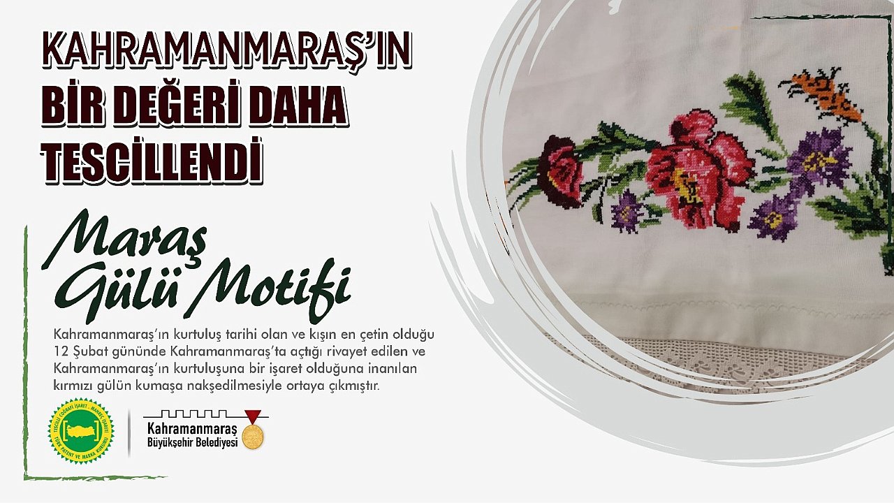 Mahalle ve Tarım Hizmetleri Dairesi Başkanlığı’ndan tescile ilişkin yapılan açıklamada, “Kahramanmaraş’ın kurtuluş tarihi ve kışın en çetin olduğu 12 Şubat gününde Kahramanmaraş’ta açtığı rivayet edilen, Kahramanmaraş’ın kurtuluşuna bir işaret olduğuna inanılan kırmızı gülün kumaşa nakşedilmesiyle ortaya çıkan Maraş Gülü Motifi, Türk Patent ve Marka Kurumu tarafından tescil edilerek şehrimizin koruma altındaki ürünleri arasında yerini aldı. Önümüzdeki süreçte de şehrimizin yöresel lezzetlerine ve el sanatlarına sahip çıkarak, coğrafi işaret tescilli ürünlerimizin sayısını artırmaya devam edeceğiz” ifadelerine yer verildi.