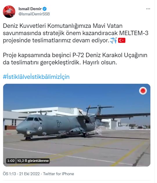 Deniz Kuvvetleri Komutanlığı'na Mavi Vatan savunmasında stratejik önem kazandıracak MELTEM-3 projesinde teslimatların devam ettiğini kaydeden Başkan Demir, "Proje kapsamında beşinci P-72 Deniz Karakol Uçağının da teslimatını gerçekleştirdik. Hayırlı olsun." ifadelerini kullandı.