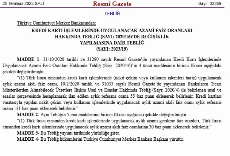 Ayrıca, enflasyonun kontrolü ve iç talebin dengelenmesi kapsamında kredi kartı nakit kullanımlarına ve kredili mevduat hesaplarına uygulanan aylık azami faiz oranı yüzde 2,89'a yükseltildi.