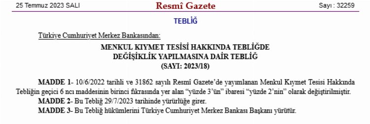 Ayrıca yine bugünkü Resmi Gazete'de yayımlanan değişiklik tebliğine göre de piyasa mekanizmasının işlevselliğini artırmak için faiz oranına göre menkul kıymet tesisi uygulaması sadeleştirildi.