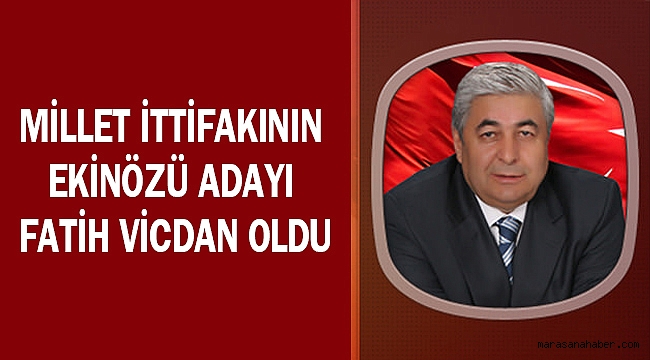Cumhuriyet Halk Partisi (CHP) ve İYİ Parti’nin oluşturduğu Millet İttifakı'nın Ekinözü Belediye Başkan Adayı Fatih Vicdan oldu. Vicdan’ın adaylığını CHP Kahramanmaraş Milletvekili aynı zamanda Millet İttifakının Kahramanmaraş Büyükşehir Belediye Başkan Adayı Ali Öztunç, sosyal medya hesabından duyurdu. 31 Mart yerel seçimleri için Cumhur İttifakı’nın adaylarının açıklanmasıyla millet İttifakı da anlaştıkları ilçelerdeki adaylarını açıklamaya başladı. Millet İttifakı kapsamında Ekinözü’nde desteklenecek aday Cumhuriyet Halk Partisi’nden fatih vicdan oldu. Vicdan’ın Ekinözü Belediye Başkan Adaylığını CHP Kahramanmaraş Milletvekili ve Kahramanmaraş Büyükşehir Belediye Başkan Adayı Ali Öztunç, sosyal medya hesabından yaptığı paylaşımla duyurdu.Öztunç, paylaşımında; “Ekinözü belediye başkan adayımız Fatih Vicdan’dır. 31 Mart akşamı Ekinözü’nde Fatih Vicdan başkanlık koltuğuna oturacak. Sürprizlerimiz devam edecek” ifadelerine yer verdi.Millet İttifakı kapsamında açıklanan ilçeler ise şöyle:Kahramanmaraş Büyükşehir Belediye Başkan Adayı Ali Öztunç (CHP)Nurhak Belediye Başkan Adayı İlhami Bozan (CHP)Pazarcık Belediye Başkan Adayı Haydar İkizer (CHP)Ekinözü Belediye Başkan Adayı Fatih Vicdan (CHP)Çağlayancerit Belediye Başkan Adayı Ahmet Nazım Engizek (İYİ Parti)Afşin Belediye Başkan Adayı Adem Yıldız (İYİ Parti)Andırın Belediye Başkan Adayı Ali ÇatalbaşDulkadiroğlu Belediye Başkan Adayı İsmail Karaca (İYİ Parti)Elbistan Belediye Başkan Adayı Aday henüz netleşmedi (İYİ Parti)Göksun, Türkoğlu, Onikişubat için görüşmeler devam ediyor.