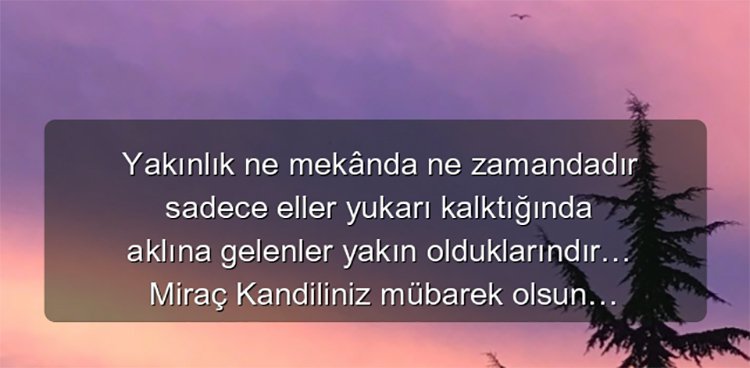 Ellerin duaya uzandığı, sinelerin dostlara açıldığı, gözlerin masumiyet aradığı bu mübarek günde tüm dualarınız kabul olması dileğiyle iyi kandiller!Yağmur yüklü bulutlar gibi gelen, eteğindeki hayır cevherlerini basımıza boşaltan ve bizlere mutluluk veren kandilin, büyüsüne kapılmanız dileğiyle Nice kandiller.Yakınlık ne mekânda ne zamandadır sadece eller yukarı kalktığında aklına gelenler yakın olduklarındır… Miraç Kandiliniz mübarek olsun…