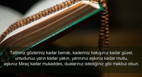 İlahi esintilerin kalpleri okşadığı, bir anın bir asra bedel olduğu bu gece dualarda birleşmek dileğiyle… Kandilinizi en içten dileklerimle kutlarım.Bugün ellerini semaya gönlünü Mevla’ya aç, bugün günahlardan olabildiğince kaç, bugün en gizli incilerini onun için saç. Çünkü bugün Miraç kandili, kandilin mübarek olsun.Borçlarımızdan, ceza ve günahlarımızdan kurtulmak için bu gece dua edelim.. Allah affeden ve bağışlayandır, unutmayalım.. Eller semaya kalkıp, yürekler bir atınca bu gece, gözler sevinç yaşlarıyla dolacak.. Kandiliniz mübarek, dualarınız kabul olsun.