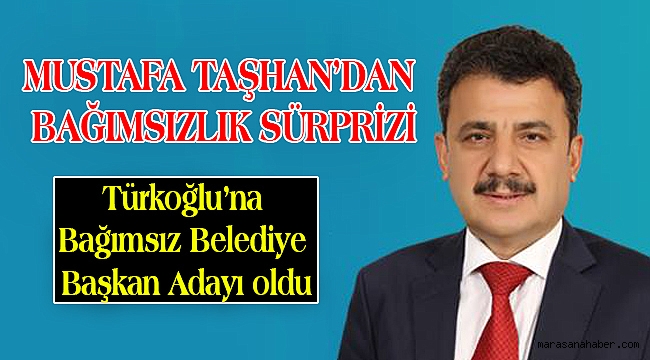 Türkoğlu Belediye eski Başkanı ve yeni dönemde AK Parti Türkoğlu Belediye Başkan Aday Adayı olan Mustafa Taşhan, Türkoğlu’na Bağımsız Belediye Başkan Adayı oldu.Türkoğlu halkının yoğun talebi karşısında aday olduğunu belirten Taşhan, halka inmeyen hiçbir ittifakın başarılı olamayacağını belirtti. Halkın kendisine bu görevi verdiğini kaydeden Taşhan, halkın emrinin başının üstünde olduğunu söyledi. Taşhan’ın Bağımsız Adaylık çıkışı, bazı çevrelerce ise soğuk duş etkisi yaptı.