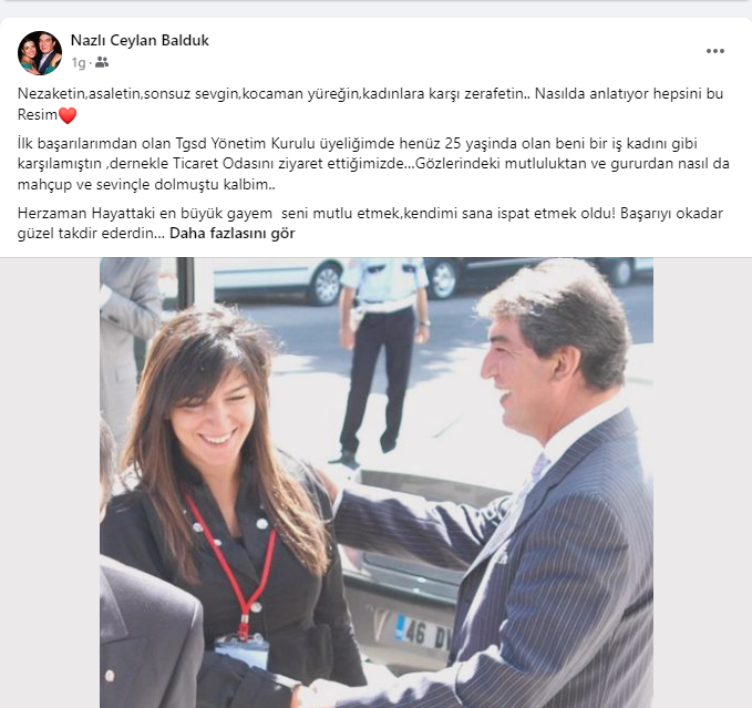 "Nezaketin, asaletin, sonsuz sevgin, kocaman yüreğin, kadınlara karşı zerafetin... Hepsini bu resim nasıl da anlatıyor. İlk başarılarımdan olan TGSD Yönetim Kurulu üyeliğimde henüz 25 yaşındaydım. Dernekle Ticaret Odası'nı ziyaret ettiğimizde, beni bir iş kadını gibi karşılamıştın. Gözlerindeki mutluluktan ve gururdan nasıl da mahcup ve sevinçle dolmuştu kalbim. Hayattaki en büyük gayem seni mutlu etmek, kendimi sana ispat etmek oldu! Başarıyı o kadar güzel takdir ederdin ki, hep başarmak gelirdi içimden."