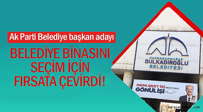 Ak Parti Dulkadiroğlu belediye başkan adayı Necati Okay, belediye binasını seçim için fırsata çevirdi. Partisince, Dulkadiroğlu Belediyesi için yeninden başkan adayı yapılan Necati Okay, başkanı olduğu belediye binasının girişine seçim afişi astırdı.