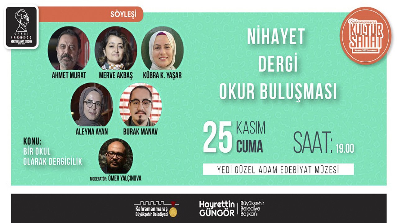 Kahramanmaraş Büyükşehir Belediyesi, Sezai Karakoç Kültür Sanat Sezonu’nda çeşitli etkinlikleri vatandaşlarla buluşturmayı sürdürüyor. Etkinlik takvimi kapsamında 25 Kasım Cuma günü, Nihayet Dergisi Genel Yayın Yönetmeni Ahmet Murat, Yazı İşleri Şefi Kübra Kuruali Yaşar, Dijital Medya Editörü Burak Manav, Editör Aleyna Ayan ve Merve Akbaş’ın katılımıyla Nihayet Dergi Okur Buluşması etkinliği gerçekleştirilecek. Yedi Güzel Adam Edebiyat Müzesi’nde düzenlenecek ‘Bir Okul Olarak Dergicilik’ konulu söyleşi, saat 19.00’da başlayacak. Yazar Ömer Yalçınova moderatörlüğünde Nihayet Dergisi’nin konuşulacağı söyleşide konuşmacılar; dergicilik, yazın hayatı ve okuma alışkanlığı gibi pek çok konuyu masaya yatıracak. Büyükşehir Belediyesi’nden yapılan açıklamada, etkinliğe tüm edebiyatseverlerin davetli olduğu belirtildi.