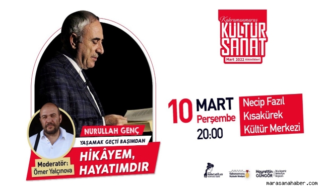 Kahramanmaraş Büyükşehir Belediyesi Mart Kültür Sanat Etkinlikleri hız kesmeden devam ediyor. Etkinlik takvimi kapsamında ay boyunca konserden tiyatro gösterilerine, konferanstan söyleşiye kadar pek çok program Kahramanmaraşlılarla buluşacak. Bu kapsamda, 10 Mart Perşembe günü (yarın) Şair Nurullah Genç ‘Hikâyem, Hayatımdır’ adlı söyleşi etkinliğinde kültür sanat dostlarıyla bir araya gelecek. Moderatörlüğünü Ömer Yalçınova’nın üstleneceği etkinlik saat 20.00’da başlayacak. Necip Fazıl Kısakürek Kültür Merkezi’nde gerçekleşecek etkinlikte yazmak, şair ve yazarın hayatını nasıl etkiler sorusuna cevap aranacak.