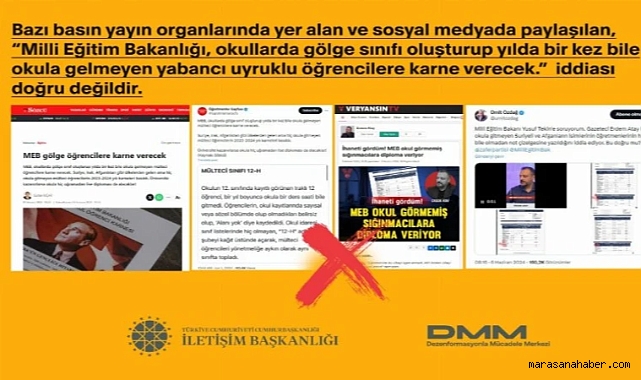 Bazı basın yayın organlarında yer alan ve sosyal medyada paylaşılan “Millî Eğitim Bakanlığı, okullarda gölge sınıfı oluşturup yılda bir kez bile okula gitmeyen yabancı uyruklu öğrencilere karne verecek” iddiasının doğru olmadığı açıklandı.ANKARA (İGFA) - Açıklama İletişim Başkanlığı bünyesindeki Dezenformasyonla Mücadele Merkezi tarafından yapıldı.2023-2024 eğitim öğretim yılının ilk döneminde İstanbul’daki çeşitli okullardan nakil olarak 12 yabancı uyruklu öğrenci geldiğine dikkati çekilen açıklamada, "Nakil geldikten sonra sürekli devamsızlık yapan öğrenciler için bugüne kadar hiçbir not girişi yapılmamıştır. Söz konusu öğrencilere karne düzenlemesi yapılması da söz konusu değildir. İlgili öğrenciler, E-Okul sisteminde kayıtlı oldukları için sistem üzerinde sınıf tekrarı yazan boş karneler görünebilmektedir. İlk dönem not almamış ve bugüne kadar herhangi bir not verilmemiş öğrencilerin 12. sınıf puanları oluşmayacağı için sınıf geçmeleri mümkün değildir. Sınıf geçemeyen öğrenciye diploma düzenlenmesi de söz konusu değildir. Kamuoyunu manipüle etmeye yönelik asılsız iddialara itibar etmeyiniz" ifadeleri yer aldı.