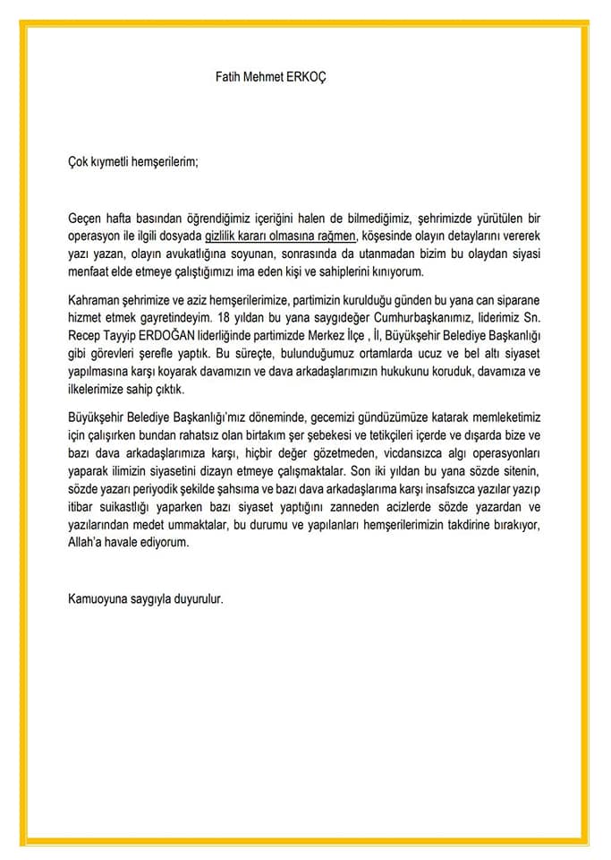 Kahramanmaraş Büyükşehir Belediyesi eski Başkanı Fatih Mehmet Erkoç, algı operasyonu yürüttüklerini ifade ettiği kişiler için; “Olaydan siyasi menfaat elde etmeye çalıştığımızı ima eden kişi ve sahiplerini kınıyorum” dedi.Kahramanmaraş’ta geçtiğimiz günlerde yapılan yolsuzluk operasyonunda rolü olduğu iddiası üzerine sosyal medyada yaşanan tartışmalar üzerine TBMM İçişleri Komisyon Başkanı ve AK Parti Kahramanmaraş Milletvekili Celalettin Güvenç’in sert açıklamalarının üzerinden bir sert açıklama da kahramanmaraş büyükşehir belediyesi eski Başkanı Fatih Mehmet Erkoç’tan geldi.Eski Başkan Fatih Mehmet Erkoç, sosyal medya hesabından yaptığı paylaşımda; iddiaları gündeme getiren kişi ve sahiplerini kınadığını belirtti. Bir takım şer şebekesinin vicdansızca algı operasyonları yaparak Kahramanmaraş siyasetini dizayn etmeye çalıştıklarını kaydeden Erkoç’un o açıklaması şöyle: