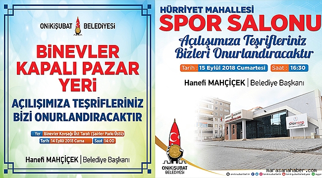 Bu kapsamda yapımı tamamlanan, hizmete açılan fakat iş yoğunluğundan dolayı açılışı gerçekleştirilemeyen Hürriyet Spor Salonu ve Binevler Kapalı Pazar Yeri açılışı gerçekleştirilecek.Daha temiz daha düzenli bir alışveriş ortamı sunacak olan Binevler Kapalı Pazar Yeri açılışı 14 Eylül Cuma günü saat 14.00’te gerçekleştirilecek.FIBA ve FIVB standartlarına uygun inşa edilmiş olan Hürriyet Spor Salonu açılışı ise 15 Eylül Cumartesi günü saat 16.30’da gerçekleştirilecek.İlçesine yenilikler kazandırmanın mutluluğunu ve gururunu yaşadığını ifade eden Onikişubat Belediye Başkanı Hanefi Mahçiçek, “Gelecek nesillerimizin çağdaş ve güvenli şartlarda spor yapabilmesi için Hürriyet Spor Salonumuzu inşa ettik. Burada gençlerimiz her türlü spor faaliyetlerini gerçekleştirme imkânı bulabilecek. Basketbol, voleybol, masa tenisi, hanımlara özel fitness salonu barındıran, resmi müsabakaların da yapılabileceği ve seyirci tribünüyle de bu alanın kentte önemli bir eksikliği gidereceğine inanıyorum.Binevler Kapalı Pazar Yerimiz sokak ortalarında alışveriş yapma sıkıntısından kurtaracak bir proje. Artık bu güzel meydanda yağmur, çamur altında kalmadan alışverişinizi çok daha rahat biçimde yapabileceksiniz. Memleketimize hayırlı ve uğurlu olsun” ifadelerini kullandı.