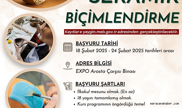 Seramik Biçimlendirme Kursu’na katılmak ve detaylı bilgi almak isteyen vatandaşlar, e-yaygin.meb.gov.tr adresi üzerinden başvurularını yapabilecek. Sanatla iç içe bir deneyim yaşamak isteyen herkes bu eğitime katılabilir.