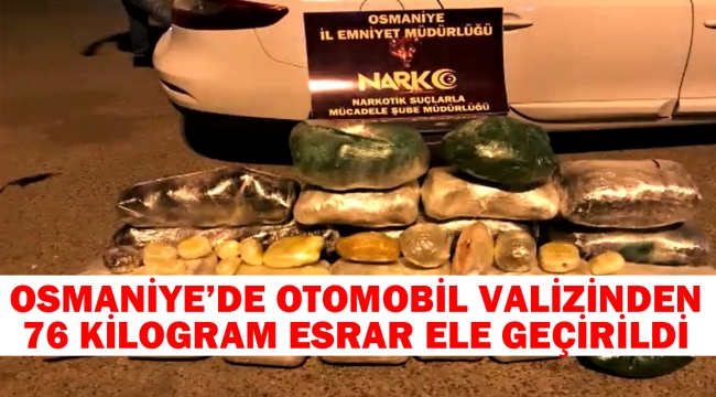 Osmaniye’de uyuşturucuyla mücadele kapsamında şüphe üzerine durulan otomobilde yapılan aramada, valiz içerisinde 76 kilogram esrar ele geçirildi.