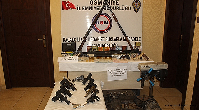 Burada yapılan aramada, çok sayıda tabanca parça ve malzemeleri ile 5 kurusıkıdan dönüştürülmüş tabanca, 2 kurusıkı tabanca ile 2 gerçek hale getirilmeye hazır kurusıkı tabanca bulundu.