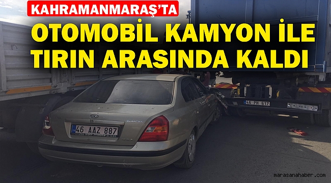 Kahramanmaraş’ta seyir halinde olan otomobil, yan yana giden kamyon ile tırın arasında sıkışması sonucu trafik kazası meydana geldi.