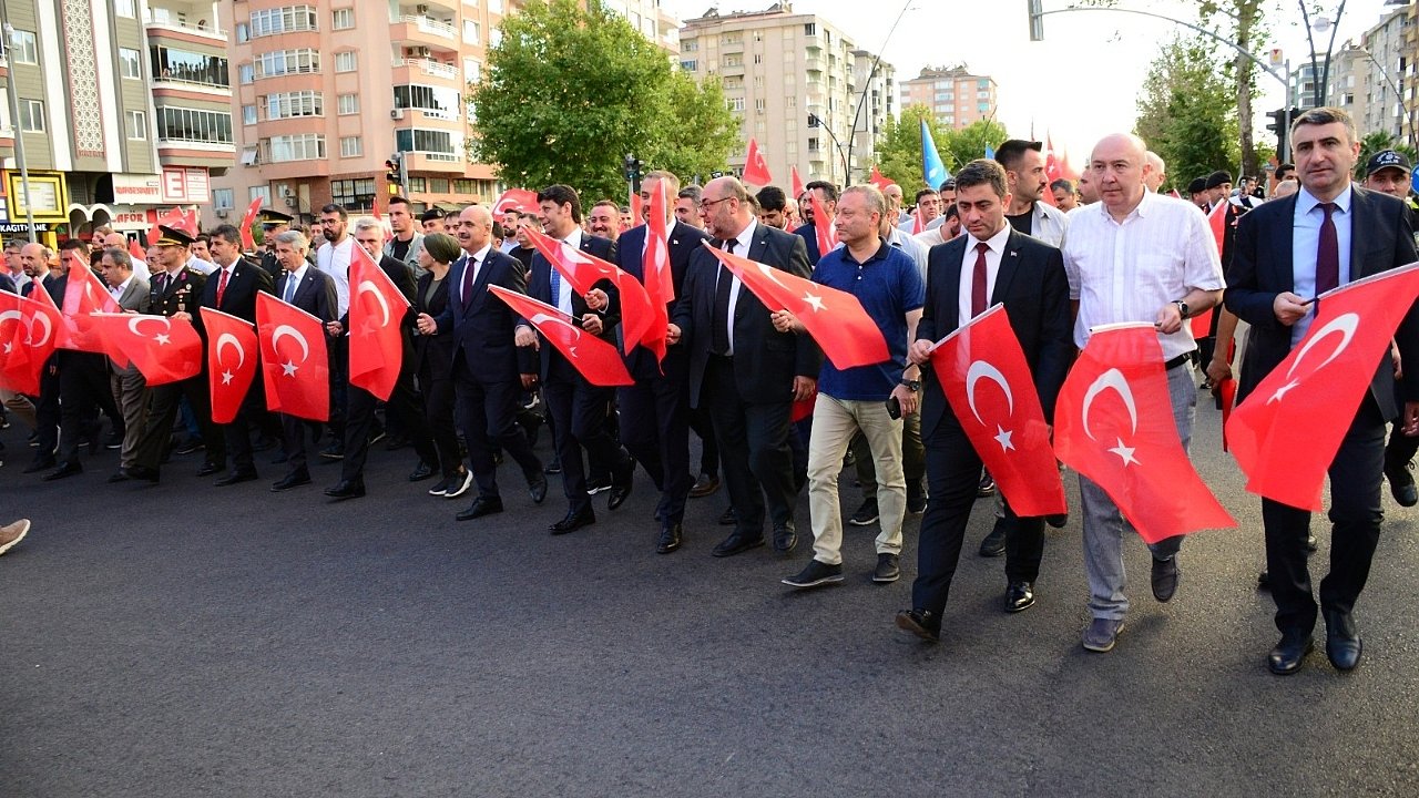 Anma etkinlikleri, 15 Temmuz Demokrasi ve Milli Birlik Günü yürüyüşü ile devam etti. Vatandaşların ve şehir protokolünün yoğun katılımıyla Onikişubat Parkı’ndan başlayan yürüyüş, mehter takımı eşliğinde meşaleler, marşlar ve Türk Bayrakları ile Necip Fazıl Kısakürek Kültür Merkezi'ne kadar sürdü. Burada düzenlenen anma programına katılan coşkulu kalabalık, programın başlangıcında saygı duruşunda bulundu ve İstiklal Marşı’nı okudu. Ardından Kuran-ı Kerim tilaveti yapıldı ve şehitler için dualar edildi.