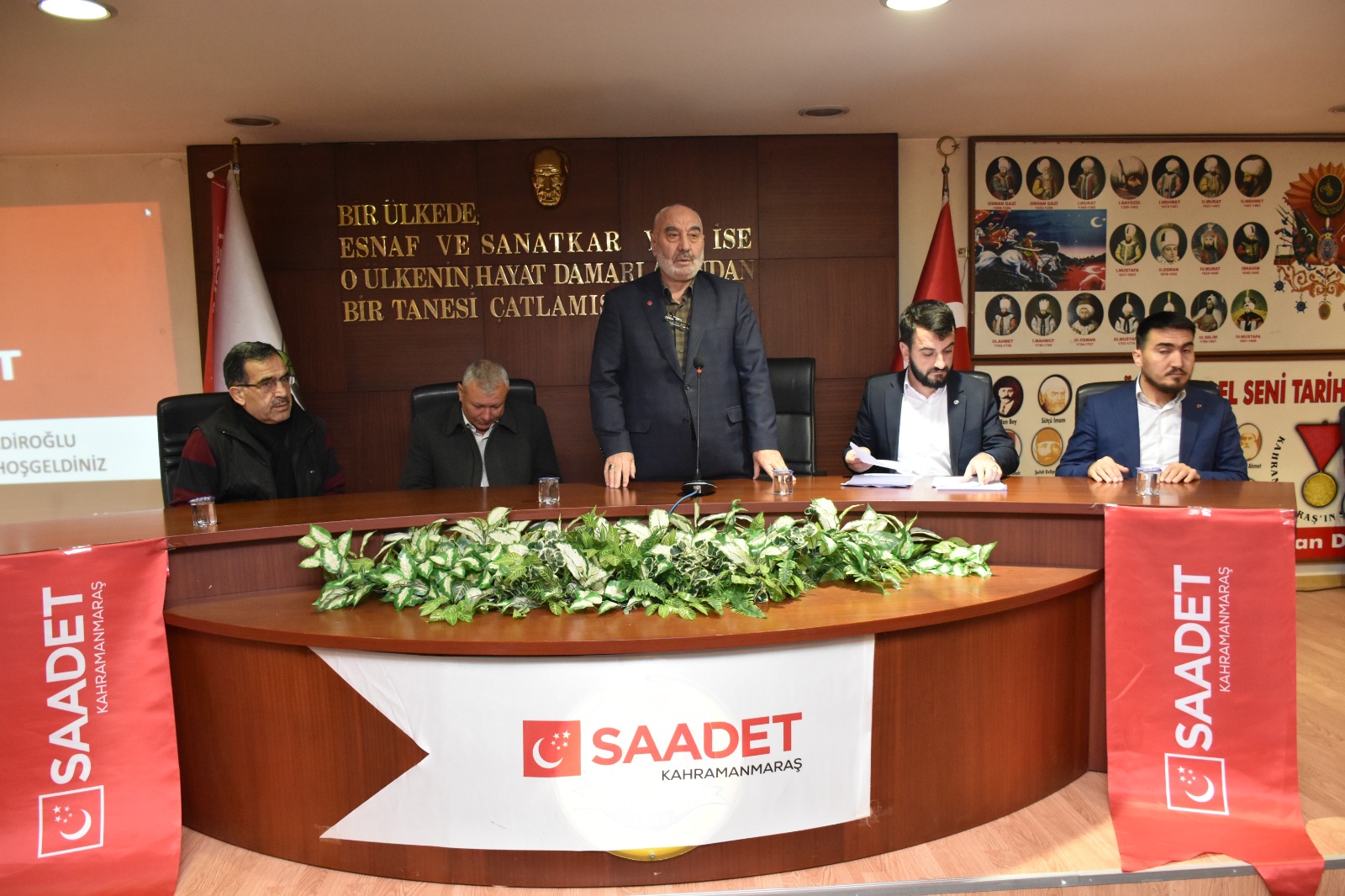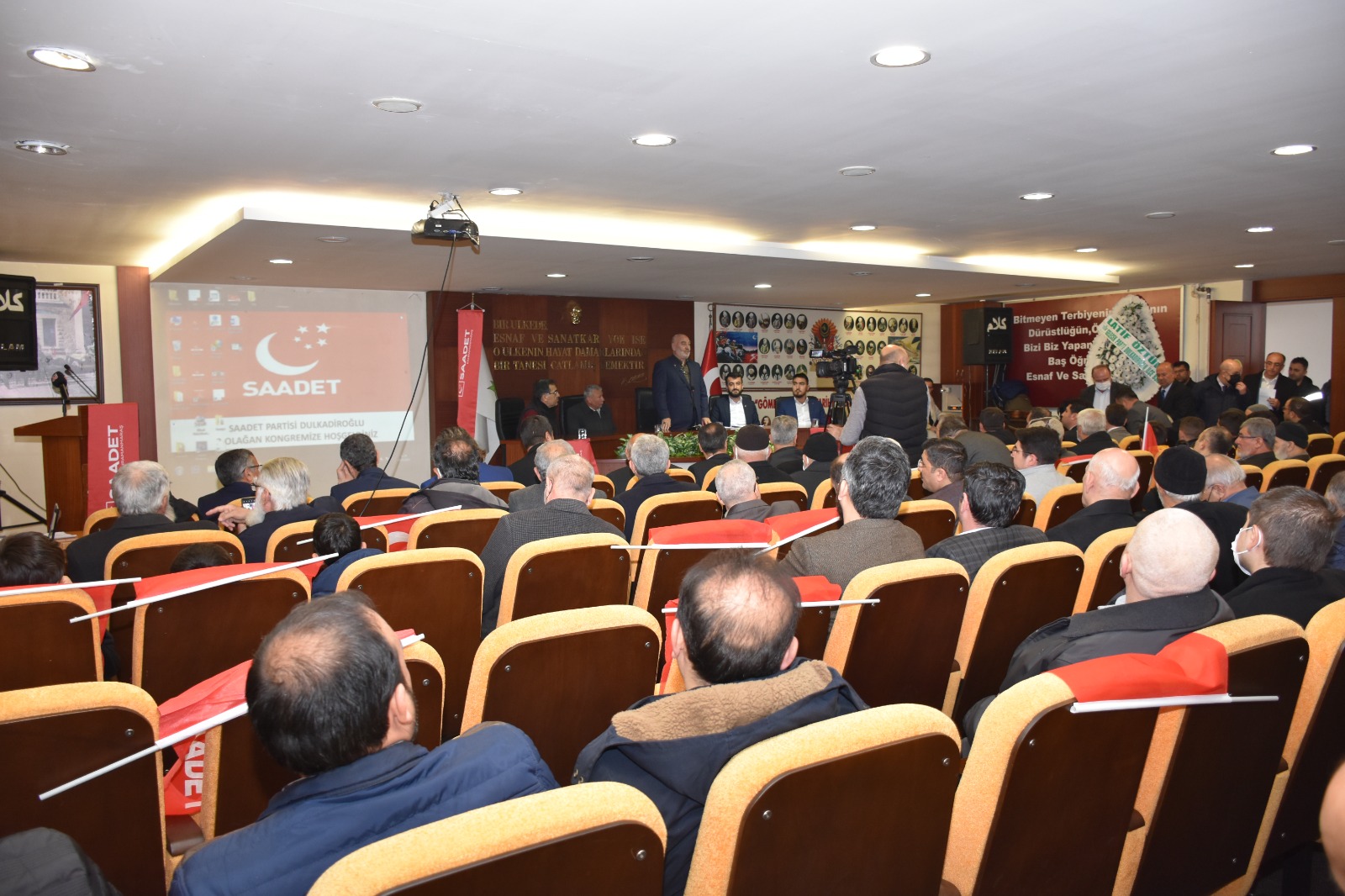 Saygı duruşu ve İstiklal Marşı’nın okunmasıyla başlayan kongrede selamlama konuşması yapan Saadet Partisi Dulkadiroğlu İlçe Başkanı Bünyamin Gökçe, katılımcılara teşekkür etti. Konuşmasına Karacaoğlan’ın şiiri ile başlayan Gökçe, “Bu küresel dünya dedikleri yerde, bu küresel düzen dedikleri yerde bizlerin yaşam alanlarını sınırlandırmak isteyenlere buradan seslenmek istiyorum: Bizim sınırlarımızı tel örgüler belirleyemez. Bizim sınırlarımızı inancımız ve imanımız belirler. Bizim kuracağımız yeni dünyada açta açıkta kalan olmayacak. Dini, dili, ırkı, rengi ve mezhebi ne olursa olsun, tüm insanlığın canını, malını, ırzını, aklını, zürriyetini, emeğini ve emeğinin karşılığını korumak bizim imani bir vazifemizdir. Taşların, kayaların, toprağın, kuşların, balıkların, meleklerin, hayvanatın ve nebatatın, havanın ve suyun lehinde dua ettiği bir topluluk olmaktan başka bir niyetimiz yoktur. Arzın sahibi, gök kubbeyi ayakta tutanın, bir saç teli hücresinin bile oluşabilmesi için bir milyon ihtimali bir araya getirenin, rızasını kazanmaktan başka bir arzu halimiz yoktur efendim” dedi.