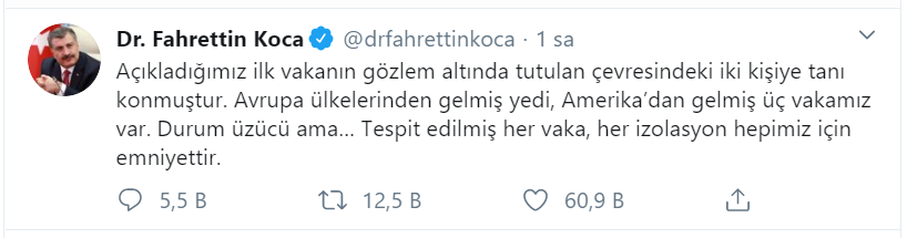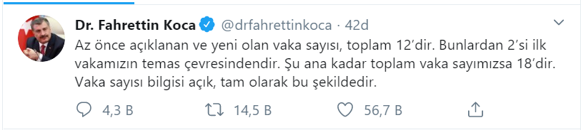 Sağlık Bakanı Fahrettin Koca, Türkiye’de baş gösteren Koronavirüs salgınında son durumu Twitter hesabından paylaştı. Bakan Koca, yeni vakaların tespit edildiğini belirterek toplam vaka sayısının 18’e yükseldiğini ifade etti.