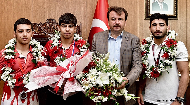 Kahramanmaraş Büyükşehir Belediyesi Güreş takımı güreşçilerinden şampiyon olanlar Büyükşehir Belediye Başkanı Fatih Mehmet Erkoç’u ziyaret ettiler.