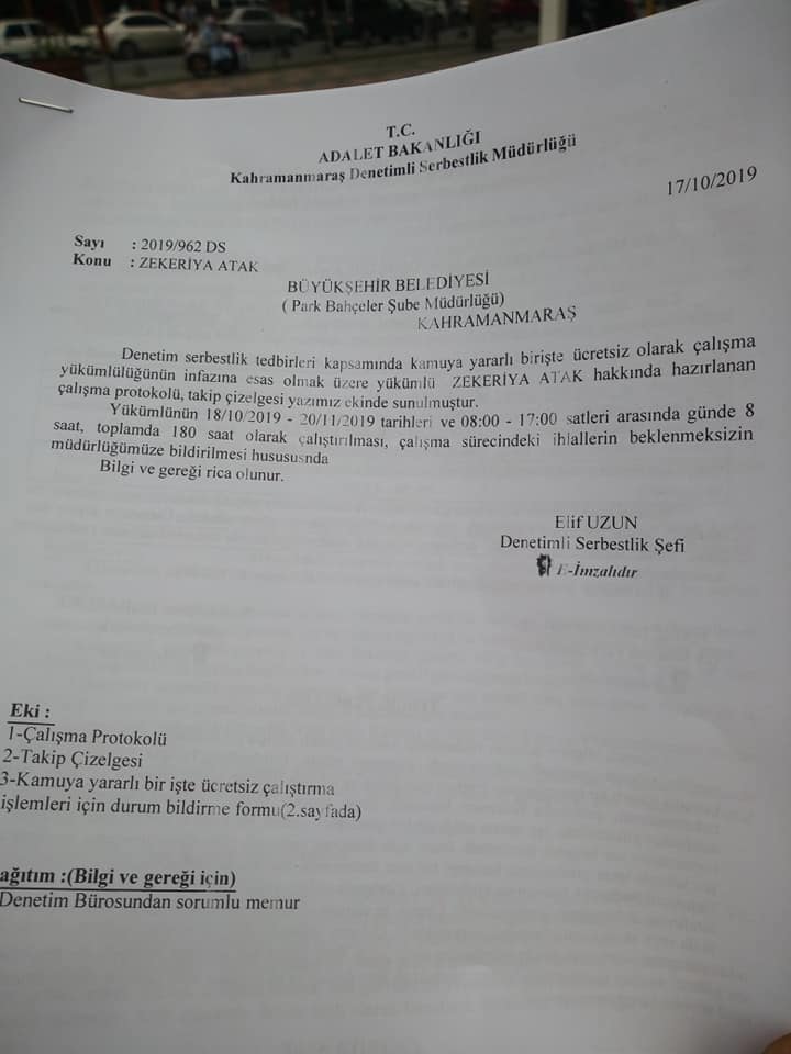 Sosyal medya fenomeni Zekeriya Atak’ın, seda sayan ile olan davasında bin 800 liralık cezayı ödememesi üzerine; denetimli serbestlik tedbirleri kapsamında kamu yararına bir işte 180 saat ücretsiz çalışmasına karar verildi. Katıldığı televizyon programlarıyla reytingleri tavan yaptıran ve magazin dünyası tarafından çok yakından takip edilen Atak, kahramanmaraş büyükşehir belediyesi Park ve Bahçeler Müdürlüğü’nde günde 8 saat, toplamda ise 180 saat ücretsiz kamu yararına çalışacak.Konuyla ilgili Kahramanmaraş Denetimli Serbestlik Müdürlüğü’nden Kahramanmaraş Büyükşehir Belediyesi Park ve Bahçeler Müdürlüğü’ne şu yazı gönderildi:“Denetimli Serbestlik tedbirleri kapsamında kamuya ayararlı bir işte ücretsiz çalışma yükümlülüğünün infazı esas olmak üzere yükümlü zekeriya atak hakkında hazırlanan Çalışma Protokolü, takip çizelgesi yazımız ekinde sunulmuştur.Yükümlünün 18/10/2019 – 20/11/2019 tarihleri ve 08.00-17.00 saatleri arasında günde 8 saat, toplamda 180 saat olarak çalıştırılması çalışma sürecindeki ihlallerin beklenmeksizin müdürlüğümüze bildirilmesi hususunda bilgi ve gereği rica olunur.”