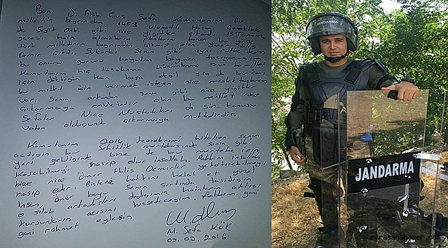 "Ben jandarma astsubay çavuş Sefa Kök. Komutanım bu milletin bağrından 1453'de Ulubatlı Hasan, Çanakkale'de Seyit Onbaşı gibi nice yiğitler çıkardı. 15 Temmuz gecesi hain alçakların planlarını bozan bu yüce Türk milletinin bağrından Ömer Halisdemir çıktı. Şükür ki seninle aynı rütbedeyim. Bu onuru, gururu ömrüm boyunca taşıyacağım. Komutanım hiç tasalanma, hüzünlenme. Senin bu millet için döktüğün kan boşa değil. Sırada bu canı bu millet için vermek isteyen nice meslektaşlarım var. Senin arkandan, senin gibi nice yiğitler çıkarmaya muktedir olan bu millet, nice Sefaları, Mustafaları da söz konusu vatan olduğunda çıkarmaya muktedirdir. Komutanım 2014 devrelerimi hitaben, senin açtığın bu şehitlik mertebesinde senin gibi yeri geldiğinde bize de bu mertebe için koşabilmeyi nasip eder inşallah. Rabbim inşallah bize nice Ömer Halisdemirler yetiştirebilmeyi nasip eder. Bizlere hakkını helal et güzel insan. Ömür boyu senin sırtında taşıdığın o silah arkadaşları dediğimiz hainlerin attığı kurşunların acısını hissedeceğim. Rabbim gani gani rahmet eylesin"