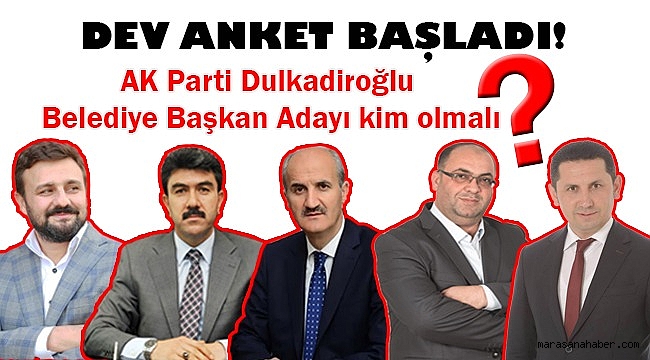 ANKETE KATILMAK İÇİN TIKLAYIN!Mart 2019’da gerçekleştirilecek olan yerel seçimlere 6 aydan az bir süre kaldı. Maraş Ana Haber olarak AK Parti’den Dulkadiroğlu Belediye Başkan Adayı olarak kimi görmek istersiniz diye dev anketi başlattık. AK Parti Dulkadiroğlu Belediye Başkan Aday Adayı olarak Dulkadiroğlu Belediye Başkanı Necati Okay’ın yanında Dulkadiroğlu Belediye Başkan Yardımcısı Mehmet Akif Kahveci, Bertiz Vakfı eski Başkanı Erdoğan Eryılmaz, onikişubat belediye meclis Üyesi mehmet akpınar ve onikişubat belediye meclis Üyesi oğuz bağrıaçık gibi isimler geçiyor. Siz de AK Parti Dulkadiroğlu Belediye Başkan Adayı olarak kimi görmek istiyorsanız lütfen ankete katılın!ANKETE KATILMAK İÇİN TIKLAYIN!