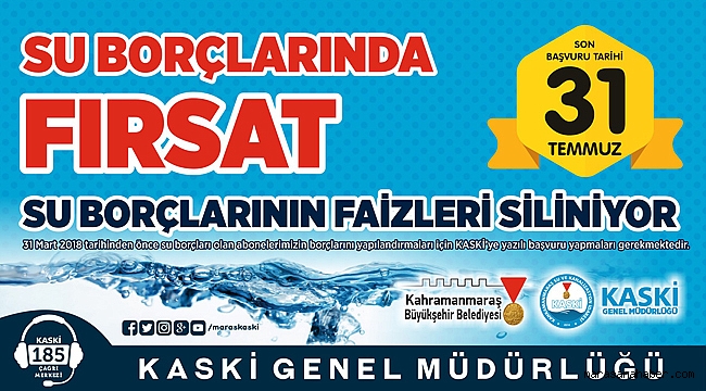 KASKİ Genel Müdürlüğünce 7143 sayılı kanun kapsamında 31 Mart 2018 tarihinden önceki su borçları, yapılandırma kapsamına giriyor. Vatandaşlar, 31 Temmuz 2018 tarihine kadar KASKİ Genel Müdürlüğüne ve İlçe Şube Müdürlüklerine müracaat etmeleri halinde su borçlarını; peşin, 6, 9, 12 ve 18 taksit imkânlarından faydalanarak ödeyebilirler.