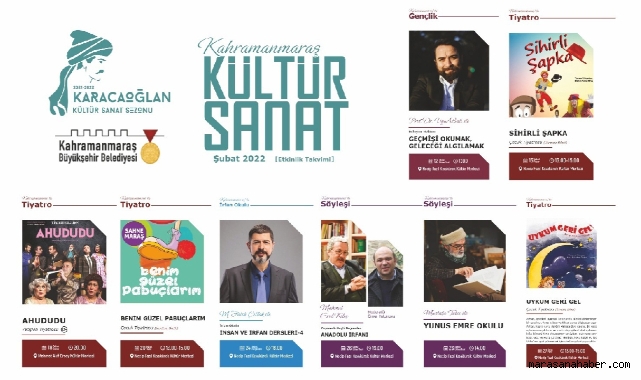 Kültür, Spor ve Turizm Dairesi Başkanlığı’ndan etkinliklere ilişkin yapılan açıklamada, “Artık geleneksel hale gelen aylık kültür sanat etkinliklerimiz Şubat’ta da devam ediyor. Etkinlikler kapsamında söyleşi, panel, konferans gibi programlarda uzman konuklar sanatseverlerle buluşuyor. Ayrıca düzenlenen Kültür Sanat etkinliklerimizde çocuklar ve yetişkinler için pek çok tiyatro oyunu yer alıyor. Sanatseverler Şubat ayı etkinlik takvimine https://kahramanmaras.bel.tr/duyuru/2022/02/07/subat-ayi-kultur-sanat-sezonu-etkinlik-takvimi adresinden ulaşabilir. Etkinliklerimize tüm vatandaşlarımız davetlidir” ifadelerine yer verildi.