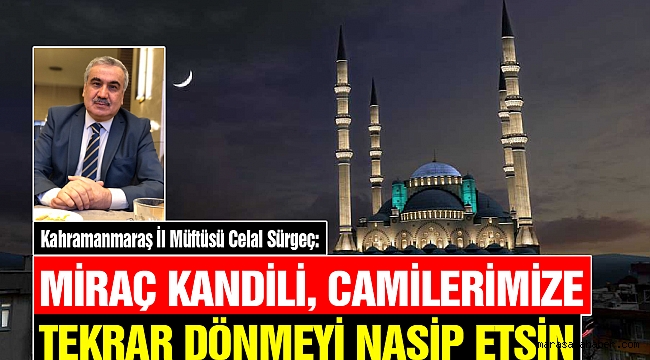 Kahramanmaraş İl Müftüsü Celal Sürgeç, Miraç Kandili dolayısıyla yayımladığı mesajında, “Kandilimizin aleminin birlik, dirlik, güven ve beraberliğine, toplumsal birlikteliğimizin güçlenmesine vesile olmasını, küresel bir musibete dönüşen bu hastalığı üzerimizden bir an evvel defedip dünyamızı tertemiz eylemesini ve camilerimize tekrar dönüp daha bir coşkuyla ve aşkla ibadetlerimizi eda etmemizi nasip eylesin” dedi.