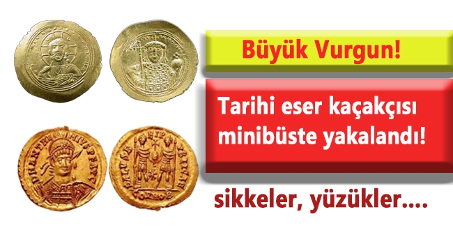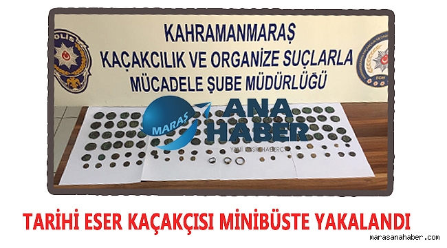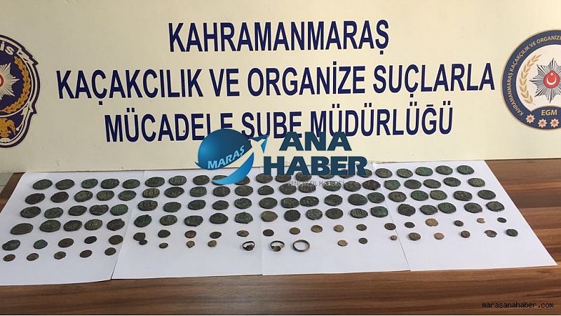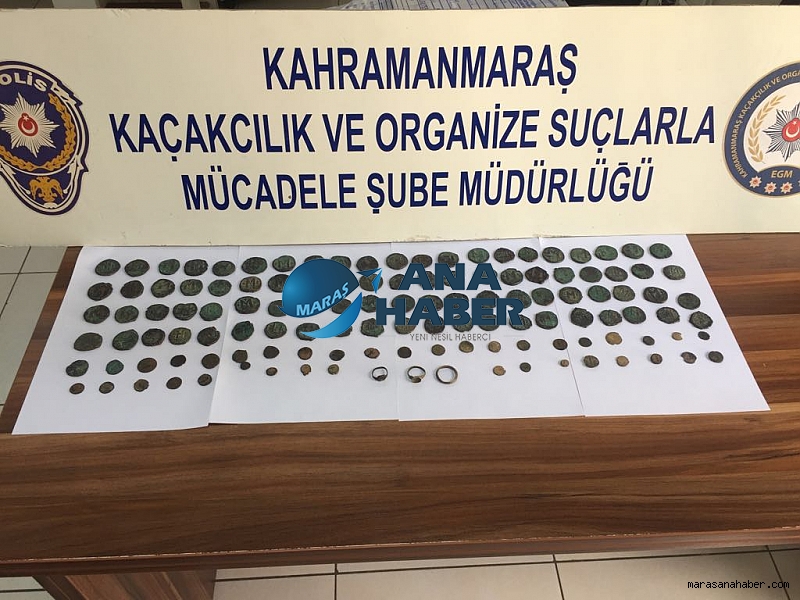 Kahramanmaraş İl Emniyet Müdürlüğü Kaçakçılık ve Organize Suçlarla Mücadele Şube Müdürlüğü Mali Büro Amirliği ekipleri tarafından şehir içi yolcu taşıyan bir minibüste yapılan aramada; yolcu konumundaki Y.Z., isimli şahsın üzerinden Roma ve Bizans dönemine ait sikke ve yüzükler ele geçirildi.