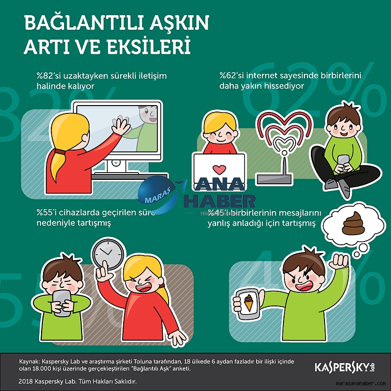 Günümüzün dijital dünyasında, çiftlerin iletişim kurmak ve birbirleriyle bağlı kalmak için cihazlara bağımlı olması artık normal hale geldi. Ancak, Kaspersky Lab’in en son araştırmasına göre “bağlantılı aşk”, avantajlarının yanı sıra dikkate alınması gereken dezavantajlara da sahip. Örneğin, Türkiye’de çiftlerin %66’sı cihazlarla fazla vakit geçirdiği için tartışıyor. Bu da genelde çiftleri yakınlaştıran cihazların, kişileri birbirinden uzaklaştırıp ilişkileri riske atabileceğini de gösteriyor.