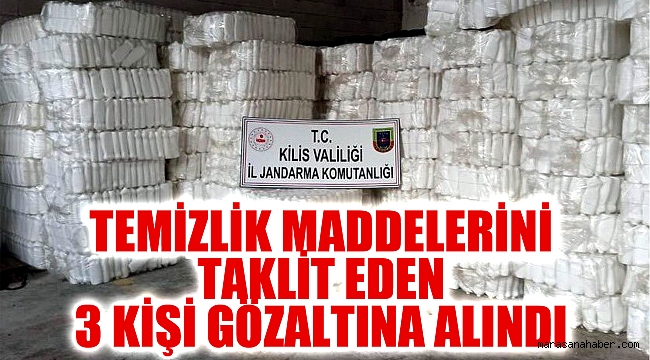 Kilis’te jandarma ekipleri tarafından temizlik maddelerin taklitlerini üreten adrese düzenlenen operasyonda 3 kişi gözaltına alındı.