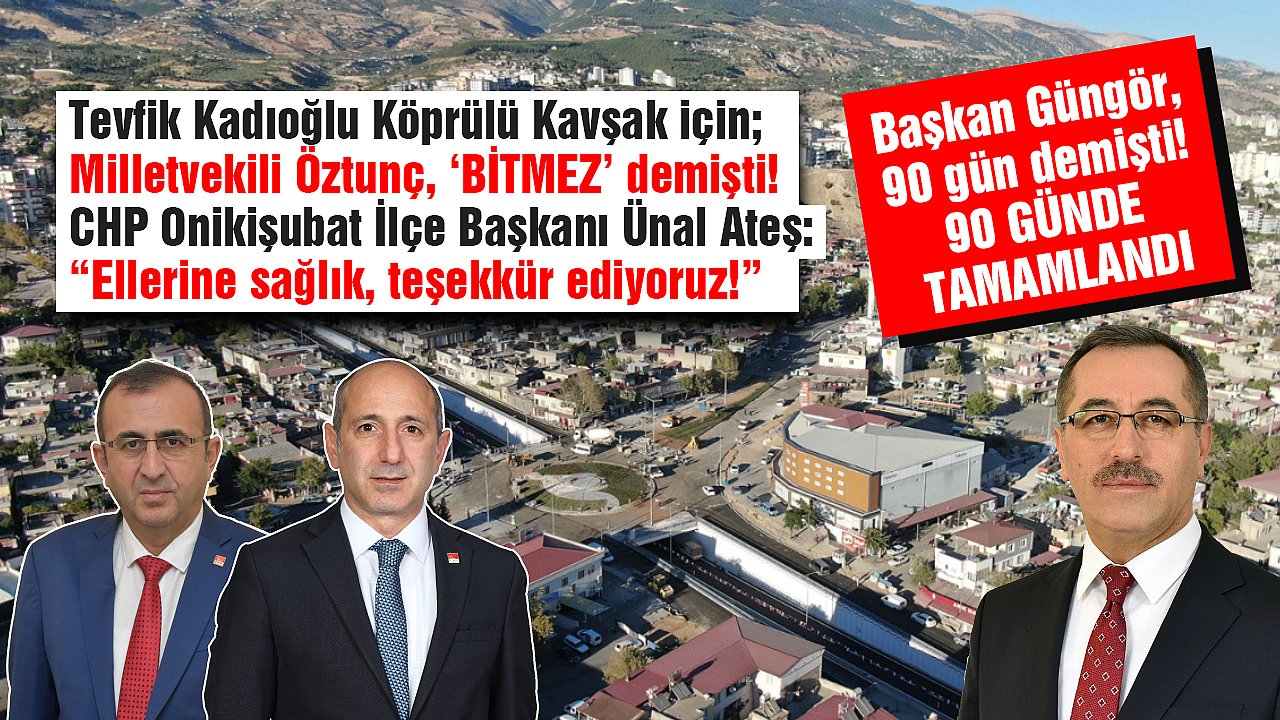 Kahramanmaraş Büyükşehir Belediye Başkanı Hayrettin Güngör tarafından 90 günde tamamlanma sözü verilen Tevfik Kadıoğlu Köprülü Kavşağı, 9 Eylül Cuma günü trafiğe açılıyor. 210 günlük yapım süresine rağmen 90 günde trafiğe açılacak olan yatırım, muhalefetin de dengesini bozdu. Geçtiğimiz hafta Kahramanmaraş’ta basın toplantısı yapan CHP Milletvekili Ali Öztunç projenin tamamlanamayacağını iddia ederek, “Tevfik Kadıoğlu Bulvarı için son 7 gün diyor değil mi? 7 gün sonra göreceğiz bitecek mi bitmeyecek mi. Dilime fena düşeceksin. Bütün ülkeye reklam yapacam. Bilboardlara çıkacam. Milletle dalga geçiyorlar, millete yalan söylüyorlar” ifadelerini kullanmıştı.