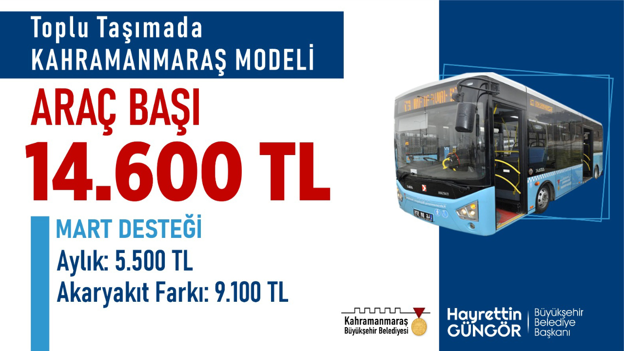 Kahramanmaraş’ın Türkiye’de bir ilke imza attığının altını çizen Başkan Güngör, “Büyükşehir Belediyesi olarak özel halk otobüslerimize her ay araç başı 5 bin 500 TL maddi destekte bulunuyoruz. Ayrıca şoför esnafımıza aylık akaryakıt farkını da ödeme kararı almıştık. Böylece Türkiye’de bir ilke imza attık. Bu uygulamamıza da ‘Kahramanmaraş Modeli’ adını verdik. Şubat ayında otobüs esnafımıza araç başı sabit 5 bin 500 TL’ye ek olarak bin 800 TL’de akaryakıt farkı olmak üzere toplamda 7 bin 300 TL destekte bulunduk. Mart ayında da sabit 5 bin 500 TL’ye ilaveten akaryakıt fiyat farkı olarak da 9 bin 100 TL maddi destek sağlayacağız. Böylece Mart ayında otobüs esnafımıza araç başı toplam 14 bin 600 TL destekte bulunacağız. Büyükşehir Belediyesi olarak mütevazı bütçemize rağmen hem otobüs esnafımızı hem de vatandaşlarımızı mağdur etmemek adına bu destekleri veriyoruz. Bu sayede de toplu taşımada fiyat güncellemesi yapılmıyor” dedi.