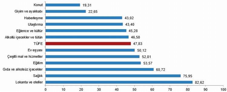 Bir önceki yılın aynı ayına göre en az artış gösteren ana grup ,31 ile konut oldu. Buna karşılık, bir önceki yılın aynı ayına göre artışın en yüksek olduğu ana grup ise %82,62 ile lokanta ve oteller oldu.