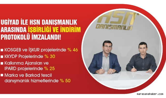 UGİYAD ve HSN Danışmanlık arasında dün imzalanarak uygulamaya konulan protokole göre; HSN Danışmanlık tarafından UGİYAD üyelerine KOSGEB, İŞKUR, KKYDP, IPARD, Kalkınma Ajansları ile iş ve meslek danışmanlık hizmetleri ücretsiz bir şekilde sağlanacak. Bununla birlikte HSN Danışmanlık tarafından KOSGEB ve İŞKUR projelendirme ücretlerinde yüzde 46, Kırsal Kalkınma Yatırımlarının Desteklenmesi Projelerinde (KKYDP) yüzde 30, Kalkınma Ajansları ve IPARD projelerinde yüzde 25 marka ve barkod tescil danışmanlık hizmetlerinde yüzde 50 indirim uygulanacak. Protokol kapsamında Kahramanmaraş’ta örneği olmayan iş kollarına yönelimlerde tamamen ücretsiz projelendirme hizmeti verilecek olup; UGİYAD üye ve birinci derece yakınlarının iş ve meslek seçimi ile ilgili başvurulacak danışmanlık hizmetleri de tamamen ücretsiz sağlanacak.