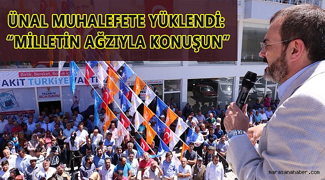 AK Parti Genel Başkan Yardımcısı ve Parti Sözcüsü Mahir Ünal, "Terör örgütlerinin ağzıyla konuşmayın, milletin ağzıyla konuşun. Siyasi görüşünüz farklı olabilir ama 'Avrupa bize destek verirse Erdoğan'ı deviririz' diyemezsiniz ama 'Millet bize destek verirse Erdoğan'ı değiştiririz' diyebilirsiniz. Bir kere de bu milletin ağzıyla konuşun. Bu millete yaslanarak konuşun. Bu milletin derdiyle, hassasiyetleriyle birlikte konuşun." dedi. Ünal, partisinin Kahramanmaraş'ın pazarcık ilçesindeki seçim bürosunu ziyaretinde yaptığı konuşmada, Türkiye'de hizmeti yaparsa yine AK Parti'nin yapabileceğini bildirdi.Fırat Kalkanı ve Zeytin Dalı Harekatlarıyla terör koridorunu darmadağın ettiklerini, Mart ayından bu yana da Irak'ta terör örgütünün kamplarını yerle bir ettiklerini belirten Ünal, "Allah'ın izniyle o Kandil'i de yerle bir edeceğiz." ifadesini kullandı.Ünal, bu ülkede Kürt, Türk, Alevi, sünni hepsinin kardeş olduğunu vurgulayarak, şöyle devam etti:"Biz demokratik siyaset diyoruz. Demokratik siyasetle beraber silah bir arada olmaz diyoruz. Şiddet bir arada olmaz diyoruz. Siyaset kurumu sorunların çözümü için asli kurumdur. Eğer biz sorunlarımızı çözeceksek siyasetle çözeceğiz. Millet sandığa gidecek, temsilcisini seçecek, o temsilci de gidip Türkiye Büyük Millet Meclisinde siyaset yapacak, temsil ettiği kesimlerin sorunların çözecek. Demokratik siyaset budur. Sen silahı alacaksın, silahların gölgesinde siyaset yapacaksın. Sen acımadan bebekleri ve sivil insanları katledeceksin, ondan sonra da gelip bana siyasetten ve demokrasiden, haklardan ve özgürlüklerden bahsedeceksin. Sen önce elindeki kanı temizle."Mahir Ünal, çırağa dükkan bırakılamayacağını, acemi siyasetçiye de ülke emanet edilmeyeceğini belirtti."Bir kere de bu milletin ağzıyla konuşun"Bir kişinin sözlerine değil, yaptığı işlere bakılması gerektiğine dikkati çeken Ünal, "Hangi siyasi görüşten olursan ol, vatan söz konusu olduğunda, bayrak söz konusu olduğunda, memleket ve millet söz konusu olduğunda, bütün siyasi farklılıkları bir kenara bırakıp, o bayrağın altında, o milletle bir olarak, o vatan için tek yürek ve tek bile olacaksın." ifadesini kullandı.Ünal, kendileri Afrin'e girelim, terör koridorunu parçalayalım" dediklerinde, "Afrin'e girmeyin, oraya girerseniz batağa saplanırsınız" denildiğini aktararak, şunları kaydetti:"Kandil'i yerle bir edelim dediğimizde 'Seçime 16 gün kala Kandil'e mi gidilir...' Harekat martta başladı, senin dünyadan haberin yok. Sen nasıl bu ülkeyi yöneteceksin. Bu ülkenin güvenliğini, bu ülkenin sınır güvenliğini, dört terör örgütünün saldırısını nasıl püskürtüp, evlatlarımın, kızlarımın, bacılarımın, analarımın, bu ülkenin her bir ferdinin güvenliğini sen nasıl sağlayacaksın. Konuştuğun zaman fetÖ ağzıyla konuş, PKK ağzıyla konuş. Biz de diyoruz ki terör örgütlerinin ağzıyla konuşmayın, milletin ağzıyla konuşun. Siyasi görüşünüz farklı olabilir ama 'Avrupa bize destek verirse Erdoğan'ı deviririz' diyemezsiniz ama 'Millet bize destek verirse Erdoğan'ı değiştiririz' diyebilirsiniz.Bir kere de bu milletin ağzıyla konuşun. Bu millete yaslanarak konuşun. Bu milletin derdiyle, hassasiyetleriyle birlikte konuşun."Ünal, daha sonra ilçe esnafını ziyaret etti.