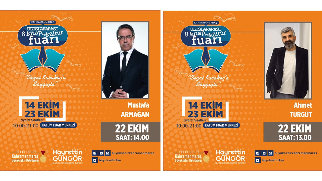 Kahramanmaraş Büyükşehir Belediyesi tarafından “Sezai Karakoç’a Saygıyla” temasıyla düzenlenen Uluslararası 8. Kitap ve Kültür Fuarı, usta kalemlerin ve tanınmış simaların katılımıyla gerçekleştirilen söyleşi, imza günü, panel ve konferans etkinlikleriyle hız kesmeden devam ediyor. Fuar kapsamında 22 Ekim Cumartesi günü saat 13.00’da Yazar İlhami Ateş, Hüseyin Kayış ve Ahmet Turgut, 14.00’da Mustafa Armağan, 15.00’da Tarık Tufan, 16.00’da Mehmet Ulukütük, 17.00’da Kahramanmaraşlı Yazar Vehbi Vakkasoğlu, saat 19.00’da ise Necdet Subaşı edebiyatseverlerle bir araya gelecek. Kahramanmaraş Fuar Merkezi’nde (KAFUM) düzenlenecek etkinliklere tüm kültür sanat dostları davet edildi.