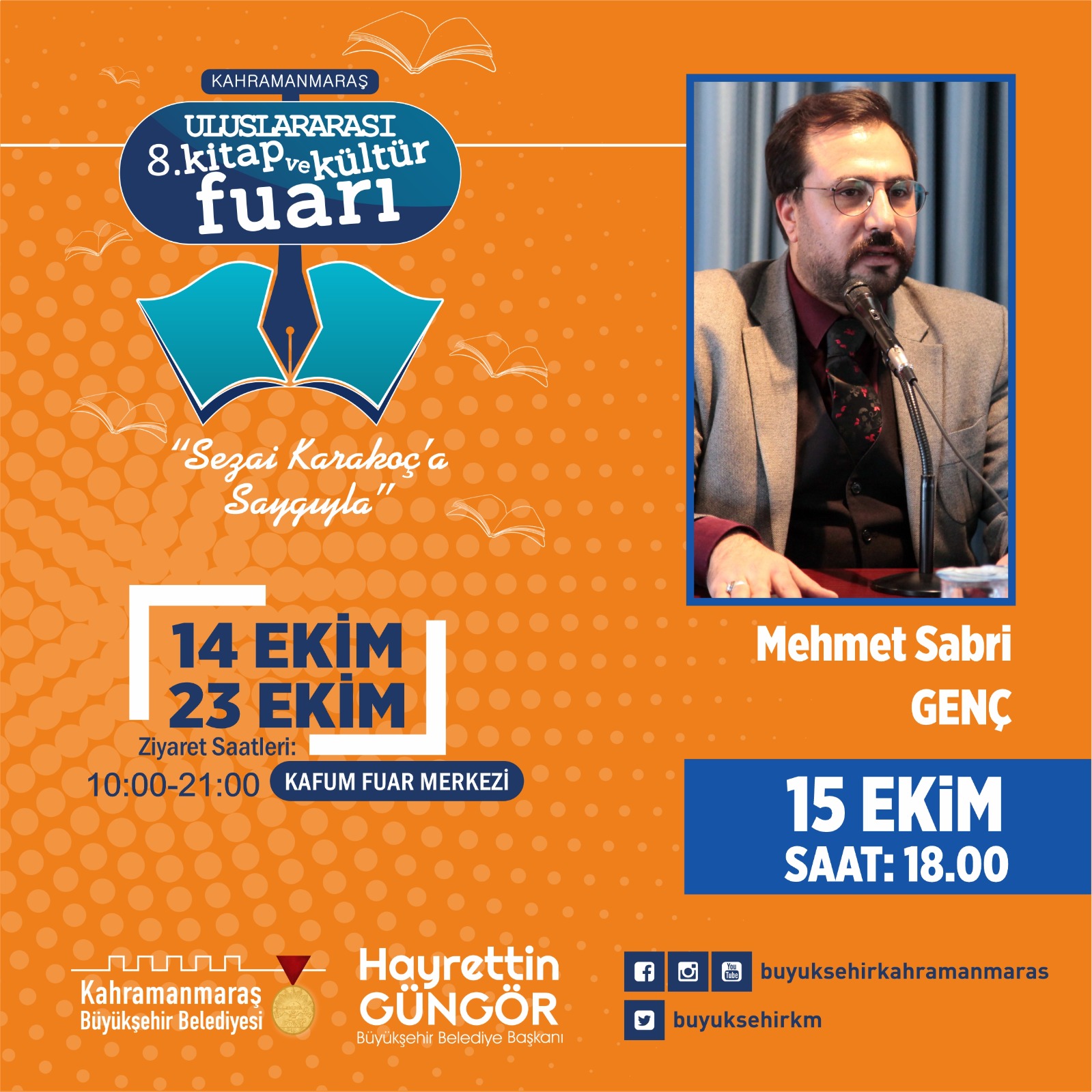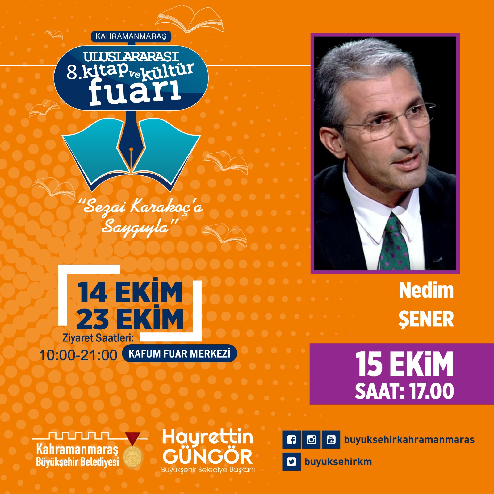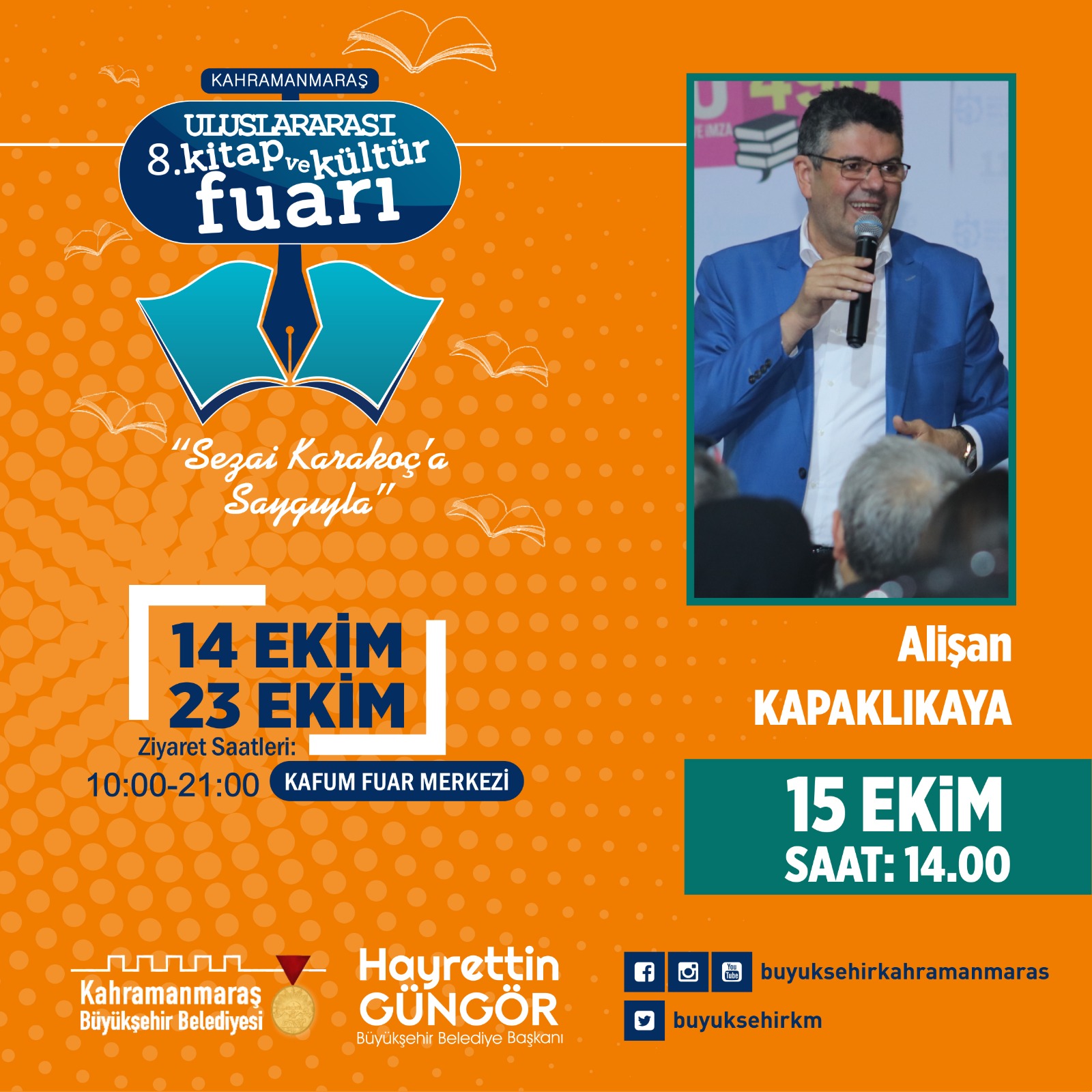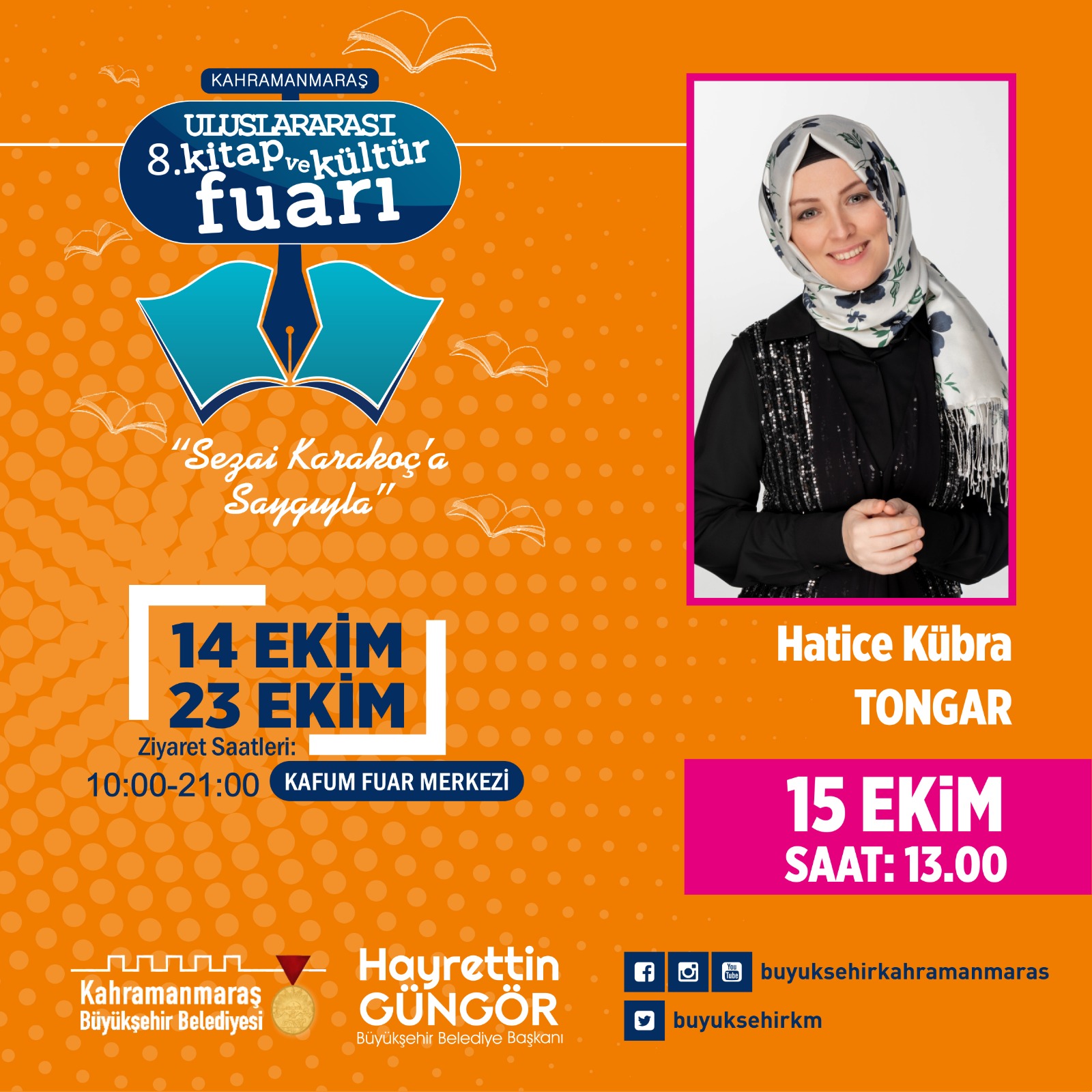Kahramanmaraş Büyükşehir Belediyesi tarafından düzenlenen 8. Uluslararası Kitap ve Kültür Fuarı’nın ikinci gününde birbirinden ünlü isimler imza günü, söyleşi ve panel etkinliklerinde kültür sanat dostlarıyla bir araya gelmeye devam edecek. “Sezai Karakoç’a Saygıyla” temasıyla düzenlenen fuar kapsamında; 15 Ekim Cumartesi saat 13.00’da Yazar Hatice Kübra Tongar, saat 14.00’da Yazar Alişan Kapaklıkaya, saat 17.00’da Gazeteci - Yazar Nedim Şener ve saat 18.00’da Yazar Mehmet Sabri Genç, KAFUM’da söyleşi etkinliğinde okurlarla buluşacak. Büyükşehir Belediyesi’nden yapılan açıklamada, söyleşi ve imza günü etkinliklerine tüm vatandaşların davetli olduğu belirtildi.