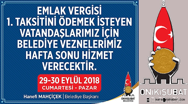Onikişubat Belediyesi’nden yapılan açıklamada yapılandırma kapsamındaki vergi borçlarının 1. taksitini ödemek isteyen vatandaşlara hafta sonu da hizmet verileceği belirtildi. 29- 30 Eylül 2018 Cumartesi ve Pazar günü vezneler hizmet verebilecek. Ayrıca borçlarını ödemek isteyen vatandaşlar Onikişubat Belediyesi www.onikisubat.bel.tr adresinden online olarak anında hizmet alabilecekler.