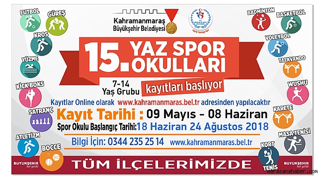 Kahramanmaraş Büyükşehir Belediyesi bünyesinde hizmet veren yaz spor okullarının açılış tarihleri belli oldu.Kahramanmaraş Büyükşehir Belediyesi tarafından bu yıl 15.’si düzenlenecek Yaz Spor Okulları’nın açılış tarihleri belirlendi.Onikişubat ve Dulkadiroğlu İlçelerine hizmet verecek merkez Yaz Spor Okulu açılışı 29 Haziran 2018 Cuma günü saat 18.00’de 12 Şubat Stadyumu’nda gerçekleştirilecek.Toplamda bu yıl 11 bin öğrencinin kayıt yaptırdığı yaz spor okullarının ilçelerdeki açılış tarihleri ise şöyle:2 Temmuz 2018 Pazartesi Andırın İlçesi saat 12.00’de Andırın Spor Salonu, Afşin İlçesi saat 15.00’de Afşin Spor Salonu, Elbistan İlçesi saat 17.00’de Elbistan Gençlik Merkezi Tesislerinde yaz spor okullarının açılışı yapılacak.3 Temmuz 2018 Salı günü Çağlayancerit İlçesi saat: 11.30’da Suni Çim Saha, pazarcık İlçesi Saat: 14:30Pazarcık Spor Salonu ve Türkoğlu İlçesi Saat: 17:00’de Türkoğlu Spor Salonunda yaz spor okullarının açılışları yapılacak.4 Temmuz 2018 Çarşamba günü Nurhak İlçesi saat 12.00’de Nurhak Spor Salonu, Ekinözü İlçesinde saat 14.00’te Ekinözü Yunus Emre Ortaokul halı sahası ve Göksun İlçesi saat 16.00’da Göksun Spor Salonu’nda yaz spor okullarının açılışları yapılacak.