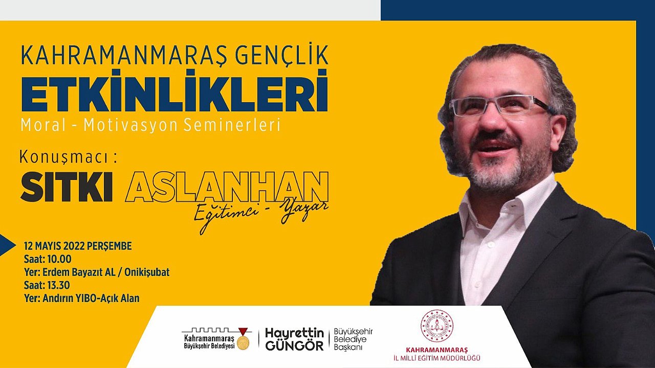 Kahramanmaraş Büyükşehir Belediyesi ve İl Milli Eğitim Müdürlüğü iş birliğiyle hayata geçirilen ‘Moral ve Motivasyon Seminerleri’ devam ediyor. Seminerler kapsamında, Kişisel Gelişim Uzmanı Eğitimci – Yazar Sıtkı Aslanhan, öğrencilerle bir araya geliyor. Hafta boyunca şehir merkezinde ve ilçelerde gerçekleştirilen seminerlerde öğrencilerle bir araya gelen Yazar Aslanhan, 12 Mayıs Perşembe günü saat 10.00’da Onikişubat Erdem Bayazıt Anadolu Lisesi ve saat 13.30’da Andırın Yatılı Bölge Ortaokulu’nu ziyaret ederek sınavlara hazırlık sürecindeki öğrencilere faydalı bilgiler aktaracak.