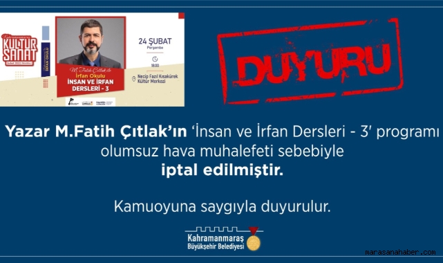 Kahramanmaraş Büyükşehir Belediyesi, Şubat Kültür Sanat Etkinlikleri kapsamında 24 Şubat Perşembe günü (bugün) saat 18.00’da Necip Fazıl Kısakürek Kültür Merkezi’nde düzenlenmesi planlanan İlahiyatçı – Yazar M. Fatih Çıtlak konferansının olumsuz hava koşulları nedeniyle ileri bir tarihe ertelendiğini duyurdu. Kültür Spor ve Turizm Dairesi Başkanlığı’ndan ertelenen etkinliğe ilişkin yapılan açıklamada, “Yaşanan hava muhalefeti nedeniyle bugün saat 18.00’da düzenlenmesi planlanan Yazar Fatih Çıtlak konferansı ileri bir tarihte gerçekleştirilmek üzere iptal olmuştur” ifadelerine yer verildi.