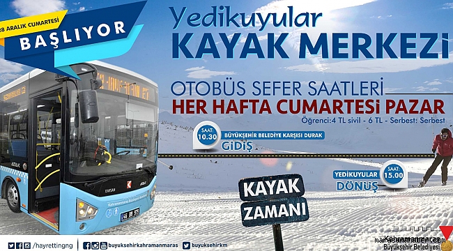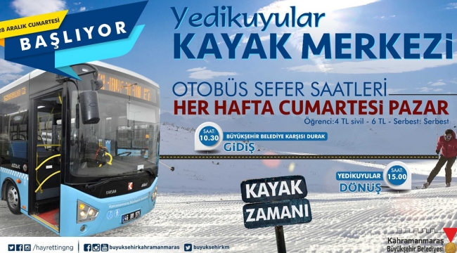 Kahramanmaraş Büyükşehir Belediyesi Yedikuyular Kayak Merkezi’ne gitmek isteyen vatandaşlar için otobüs seferlerinin 28 Aralık Cumartesi günü başlayacağını duyurdu. Büyükşehir Belediyesi’nden konu ile alakalı yapılan açıklamada: “Yedikuyular Kayak Merkezi’ne hafta sonu Cumartesi ve Pazar günleri olmak üzere haftada iki gün otobüs seferi konulmuştur. Yedikuyulara gitmek isteyen vatandaşlarımız Cumartesi ve Pazar günü saat 10.30’da Büyükşehir Belediyesi karşısındaki duraktan binebilirler. Yedikuyular Kayak Merkezi’nden ise geri dönüş saat 15.00 olarak belirlenmiştir. Yedikuyular Kayak Merkezi’ne gidiş ücreti öğrenci 4 TL, sivil ise 6 TL olarak belirlenirken, serbest kart sahipleri ise ücretsiz olarak gidecektir” denilerek bilgi verildi.